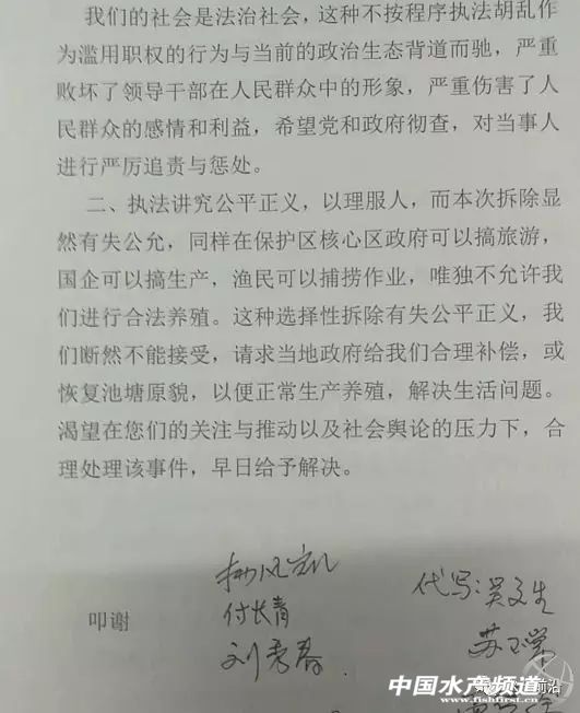 中國水產(chǎn)頻道原創(chuàng)報道, 有證無證都被拆,交了費也不能使用,無任何補償,3600蝦塘10多家養(yǎng)殖戶該怎么辦? 文/ 中國水產(chǎn)頻道 圖/ 無棣縣埕口鎮(zhèn)汪子村對蝦養(yǎng)殖戶 10月29日起,山東濱州市無棣縣埕口鎮(zhèn)汪子村的10多戶對蝦養(yǎng)殖戶遭遇了一場慘痛的經(jīng)歷。據(jù)當?shù)仞B(yǎng)殖戶楊風(fēng)凱和付長青等人告訴中國水產(chǎn)頻道,10月29日、11月9-10日,共3天時間,汪子村約3600畝南美白對蝦養(yǎng)殖塘被4-5臺挖掘機夷為平地,養(yǎng)殖戶一下子失去了賴以生存的池塘面臨一無所有,幾乎崩潰。 據(jù)楊風(fēng)凱表示,這3600畝蝦塘,大約有1600多畝辦了水產(chǎn)養(yǎng)殖證,另外約2000畝雖然沒有辦證,但也有交費即是有償使用。楊風(fēng)凱回憶道,10月29日拆除了部分蝦塘后,11月3號下午5點40左右接到無棣縣海洋與漁業(yè)局打來電話通知要注銷他的養(yǎng)殖證。到11日9號拆除蝦塘的房子,11月10號蝦塘及其它設(shè)施就全部拆除完。 養(yǎng)殖證及海域使用收費證明 養(yǎng)殖戶表示,令他們不解、困惑和傷心氣憤的是,發(fā)生這一切是在沒有得到任何通知、任何說法和任何補償?shù)那闆r之下進行的。 據(jù)相關(guān)資料顯示,汪子村的3600畝蝦塘位于自然保護區(qū)核心區(qū)的緩沖區(qū)內(nèi),無棣縣海洋與漁業(yè)局表示,他們對拆除蝦塘是有法可依的: 養(yǎng)殖戶的蝦池建立在濱州貝殼堤島與濕地的核心區(qū)內(nèi),屬于國家級自然保護區(qū),根據(jù)《中國人民共和國自然保護區(qū)條例(2017年修訂)》第三十二條規(guī)定:第三十二條在自然保護區(qū)的核心區(qū)和緩沖區(qū)內(nèi),不得建設(shè)任何生產(chǎn)設(shè)施。在自然保護區(qū)的實驗區(qū)內(nèi),不得建設(shè)污染環(huán)境、破壞資源或者景觀的生產(chǎn)設(shè)施;建設(shè)其他項目,其污染物排放不得超過國家和地方規(guī)定的污染物排放標準。在自然保護區(qū)的實驗區(qū)內(nèi)已經(jīng)建成的設(shè)施,其污染物排放超過國家和地方規(guī)定的排放標準的,應(yīng)當限期治理;造成損害的,必須采取補救措施。 養(yǎng)殖戶們則表示,在1991年,他們是政府批準的由農(nóng)業(yè)人口轉(zhuǎn)型為漁業(yè)人口的群體,并且他們已退掉了農(nóng)田,只能從事漁業(yè)行為,相關(guān)文件證明他們是合法養(yǎng)殖行為。 養(yǎng)殖戶還表示,貝殼堤島與濕地國家自然保護區(qū),成立于2006年左右,而養(yǎng)殖戶從1991年起就得到相關(guān)部分支持從事水產(chǎn)漁業(yè)生產(chǎn)。到了1998年養(yǎng)殖戶開始從事對蝦養(yǎng)殖,當時花費了300多萬元進行池塘改造,這么多年間還遭遇到2次大風(fēng)暴潮襲擊,又花約幾百萬上千萬的資金進行修理和維護。從時間上來講養(yǎng)殖戶是先來,保護區(qū)是后到的,為何拆除前養(yǎng)殖戶得不到任何通知呢? 養(yǎng)殖戶稱,國家自然保護區(qū)成立于2006年,距現(xiàn)在已經(jīng)有十多個年頭,養(yǎng)殖戶一直正常的從事水產(chǎn)養(yǎng)殖的活動,如果說違反了相關(guān)法規(guī),為什么長達十多年的時間內(nèi)養(yǎng)殖戶卻沒有收到相關(guān)部門的通知呢? 如果養(yǎng)蝦存在違規(guī)的行為,那么縣海洋與漁業(yè)局收取海域使用費,且1600多畝面積辦的養(yǎng)殖證,現(xiàn)在收費又拆除,有養(yǎng)殖證又被拆,養(yǎng)殖戶們想不明白為什么這樣。 據(jù)悉,這3600蝦塘屬于大圍(汪子)養(yǎng)殖,每畝產(chǎn)量大約在100-200斤,蝦價一般是20多元/斤,養(yǎng)殖戶們風(fēng)里來雨里去地日夜辛苦守護才能維護一家人生計,但近幾年對蝦養(yǎng)殖成功率下降、風(fēng)險更大,養(yǎng)殖戶更加努力和加倍辛苦才可能得到一定的收成。 養(yǎng)殖戶認定他們3600畝蝦塘屬于合法養(yǎng)殖,如果得不到合理賠償,他們將一夜回到解放前及破產(chǎn)。目前他們準備申訴信向相關(guān)部門申訴,請求給他們這些已失了田目前又面臨失塘的人一個合理的說法。 申訴信 1992年大河口開發(fā)區(qū)(包括汪子村)開發(fā)紀要 1991年農(nóng)轉(zhuǎn)漁文件 山東電視臺(公共頻道)對事件的報道 |