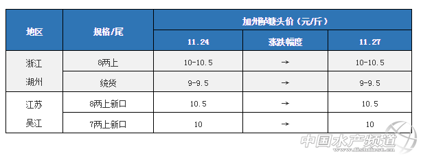 中國水產頻道原創報道,11月27日加州鱸塘頭報價及行情分析 文/圖 水產前沿 李曉欣 產區加州鱸塘頭價及行情簡析 華南地區 廣東佛山:今天佛山加州鱸新魚6兩上報價9.5元/斤左右,7兩上9.5-10元/斤,8兩上10-10.5元/斤,具體看魚頭大小及8兩上比例定價。目前魚價已經維持了近20天,由于價格低迷,養戶出小規格魚的意愿不高,寧愿放回魚塘養大再賣。隨著存塘大魚比例逐漸升高,養戶擔心存魚超標都以出大規格魚為主,外省流通商到佛山收魚增多,銷量有所上升,預計短期內魚價還是以維穩為主。 廣西南寧:南寧今天1斤上加州鱸報價12.5-13元/斤,魚價企穩。南寧本地魚達上市規格的還比較少,當地流通商多到廣東拉魚。 華東地區 浙江湖州:今天8兩上加州鱸報價10-10.5元/斤,統貨報價9-9.5元/斤,實際成交價看魚的成次。由于統貨魚價便宜,湖州當地魚中很少愿意收標魚,養戶以出統貨為主。湖州養戶為了減輕存塘壓力,出魚積極性較高。 江蘇吳江:吳江加州鱸今天報價7兩上10元/斤,8兩上10.5元/斤。由于魚價低迷,利潤空間較小,吳江養戶現在基本很少出魚。 華中地區 湖北武漢:今天武漢9兩上加州鱸報價10.5-11元/斤左右,目前魚價已經持穩了近一個月,由于魚價未達預期,當地養戶出魚意愿不強,本地銷量不大,市場以廣東魚為主。 湖南華容:華容9兩上加州鱸價格已持穩了超半個月,今天報價11元/斤。據悉,現在華容標魚所剩不多,當地出魚量有所減少。 西南地區 四川成都:成都今天9兩上報價12元/斤,當地銷量仍然較大,由于魚價較為低迷,部分養戶開始惜售。 |