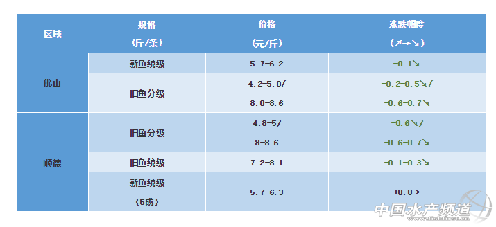 摘要: 中國水產頻道原創報道,生魚佛山順德:新魚統級5-6成左右6.0-6.2;氣溫降低病害減少,吃料減少,1萬魚一天吃2-3包料左右;病害主要有腸炎,諾卡氏,出血,肝膽綜合征。