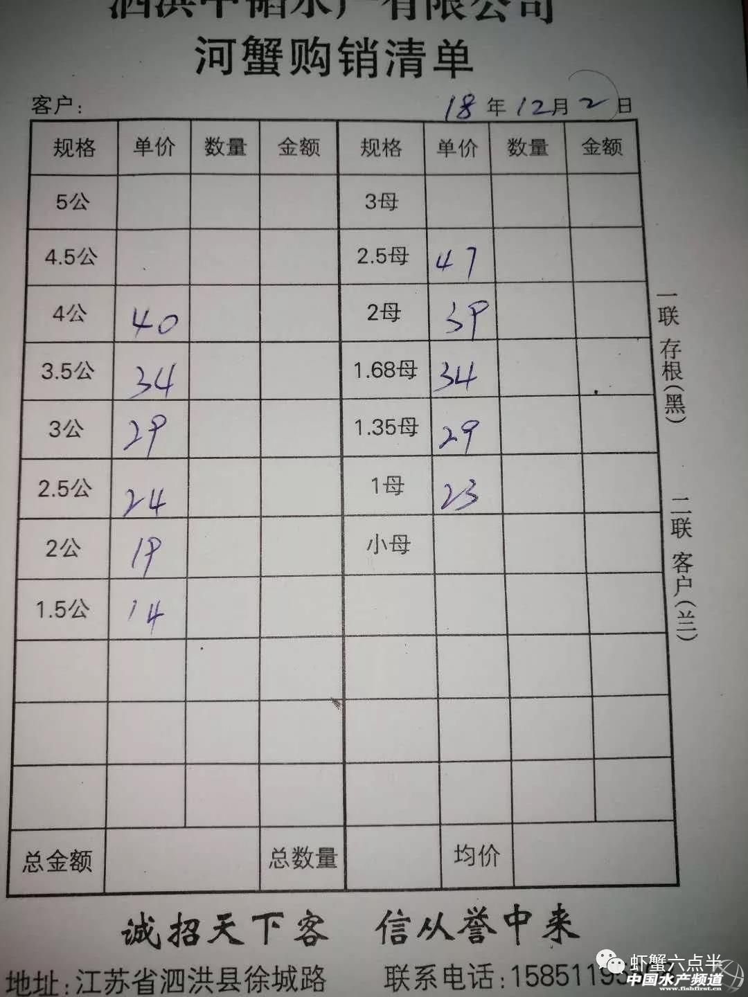 | 中國水產頻道報道, 報價是為了讓養殖戶能早點了解價格信息,根據行情盡量賣個好價錢。希望養殖戶朋友也能參與報價,提供價格信息,讓更多的人能更快更早的了解當天行情 2018.12.2 宜興 興化 上海 泗洪 湖北 常州 蟹苗 |