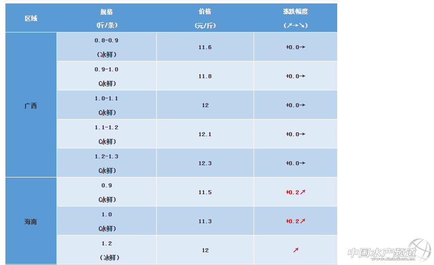 中國水產頻道原創報道,廣西區域:因為前段時間水溫低,規格魚目前存量較少,本周0.8-1.1的各規格冰鮮上漲0.1元,1.1-1.3規格魚價與上周持平,凍品價格與上周持平。凍品(新魚)200/300,10.25元/斤(平);300/400,11.5元/斤(平);400/500 12.5,元/斤(平);500/600,13元/斤(-0.25);600/700,13.75元/斤(平)。