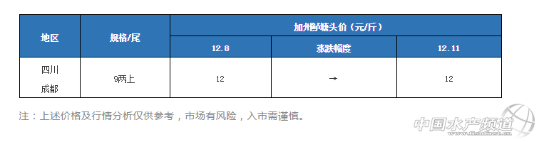 中國水產(chǎn)頻道原創(chuàng)報道,12月11日各產(chǎn)區(qū)加州鱸行情與塘頭報價 文/圖 水產(chǎn)前沿 李曉欣 今天廣東佛山8兩上加州鱸報價9.8元/斤左右,相比8日9.8-10元/斤下跌了0.2元/斤。魚價下滑主要江浙等省區(qū)魚價與廣東接近,導致外省魚車到廣東收魚減少,銷量上不去;另外,今年6月份放苗的養(yǎng)戶近期出頭箍魚,對魚價也有所沖擊。 據(jù)悉,去年同期佛山8兩上加州鱸塘頭價為9.7-9.8元/斤左右,目前魚價同比去年同期相差無幾。從上面走勢圖可知,去年12月中旬佛山8兩上加州鱸開始回暖,部分養(yǎng)戶對后市行情有所期盼,加上近期氣溫下降,出魚容易損傷導致患水霉病的風險增加,有些養(yǎng)戶選擇觀望惜售。 產(chǎn)區(qū)加州鱸塘頭價及行情簡析 華南地區(qū) 廣東佛山:佛山今天報價8兩上9.8元/斤左右,具體成交價看魚頭大小和規(guī)格比例略有浮動。魚價低于10元/斤時,順德、沙頭地區(qū)的養(yǎng)戶出魚意愿不高,加上近幾天氣溫下降,部分養(yǎng)戶觀望惜售。現(xiàn)在出魚的養(yǎng)戶以出大規(guī)格魚為主,預計短期內魚價企穩(wěn),元旦前后銷量或將有所上升。 廣西南寧:今天南寧1斤上加州鱸塘頭價依然維持在12-13元/斤,南寧本地基本很少出魚,市場以廣東魚為主。 華東地區(qū) 浙江湖州:今天湖州8兩上加州鱸報價10元/斤左右,統(tǒng)貨報價8.5-9.5元/斤左右,具體看8兩上成次。近期湖州降溫降雪,不過對出魚暫時沒有影響,本地出魚量仍較大,現(xiàn)在養(yǎng)戶以出統(tǒng)貨為主。湖州當?shù)赜袀別塘口出現(xiàn)水霉和爛身現(xiàn)象,建議養(yǎng)戶做好防范。 江蘇吳江:今天吳江加州鱸7兩上報價9.5元/斤,8兩上10元/斤。目前的魚價吳江養(yǎng)戶出魚意愿不強,當?shù)鼗竞苌俪鲷~,流通商多到湖州區(qū)域收魚,預計魚價短期內波動不大。 華中地區(qū)