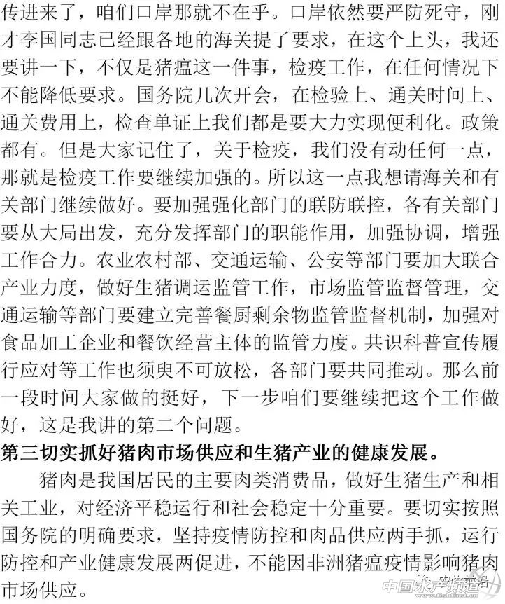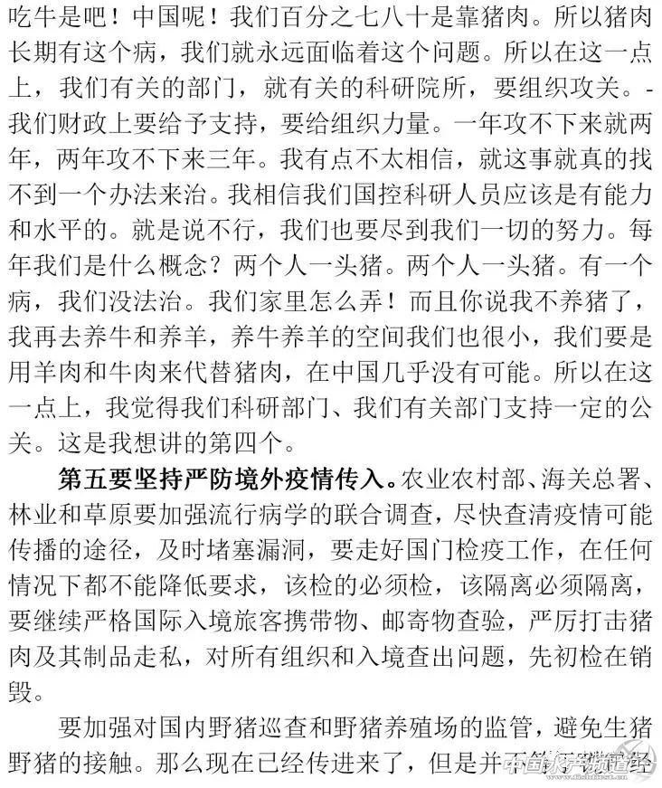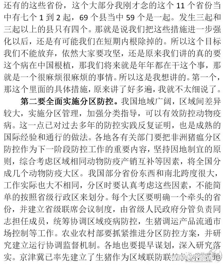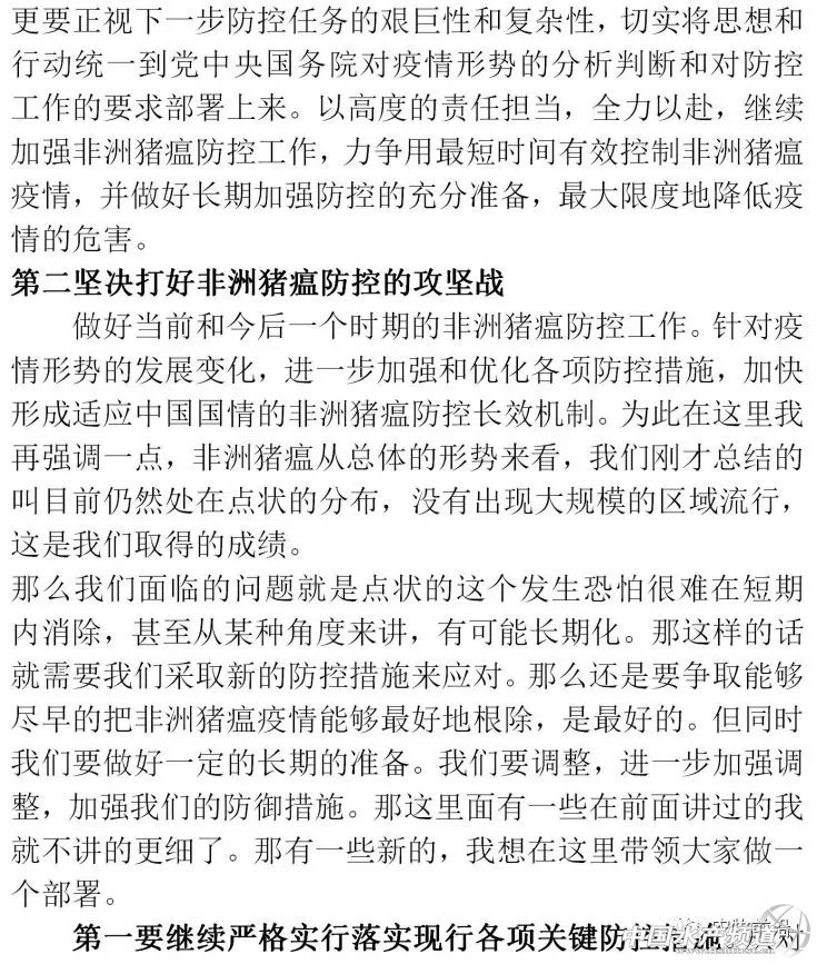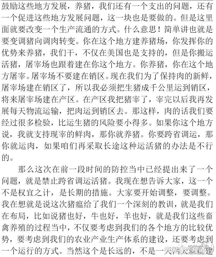中國水產頻道原創報道, 文/農牧前沿綜合整理 12月11日,全國加強非洲豬瘟防控工作電視電話會議在北京召開。中共中央政治局委員、國務院副總理胡春華出席會議并講話。胡春華指出,當前非洲豬瘟防控形勢仍然十分嚴峻,任務十分艱巨,必須堅定防控信心,強化責任落實,全面加強防控工作。 農牧前沿也留意到,此次胡春華講話透露出幾個重大信息: 非洲豬瘟傳入我國時間可能是在今年6月份以前,甚至更早,且已經在部分地方形成一定病毒污染面,難以徹底根除。 非洲豬瘟在我國的流行情況復雜,隨著野豬疫情出現,更增添疫情傳播不確定性。 全國將全面實施分區防控,分區將不按行政省份劃分,按主產區與主銷區劃分,且各區內的產銷做到大致供需平衡。 南方及大中城市周邊地區要鼓勵建設高水平高質量的養殖企業,不能盲目禁養限養。 要鼓勵和支持大型養殖企業集團在省以內和同一個大區內布局全產業鏈,推行育、繁、養、宰、銷一體化的融合發展新格局。原則上就地屠宰變運豬為運肉,保障肉品供應穩定。 養殖布局要做一定的調整,從以前區域優勢角度考慮布局養殖到從防疫角度布局養殖。 禁止跨省調運活豬將是長期的措施。 要調整完善仔豬調運監管要求,對符合條件的仔豬開通調運能力。 以下為胡春華講話要點摘錄: 截止到12月10日,全國共21個省份發生了85起家豬疫情、兩起野豬疫情,嚴重威脅畜牧業生產安全。 從防控措施來看所采取的主要措施是有效的,落實限制生豬長途調運的各項措施后,全國因生豬及風險物品引發疫情比例由35.3%下降到了18.2%。采取禁止餐廚剩余物喂豬措施后,由此引發疫情的比例由50%下降到37.7%。 當前非洲豬瘟防控形勢依然十分嚴峻,任務十分艱巨。從非洲豬瘟自身特性看,該病潛伏周期長,生豬感染后最長在三周內都不表現出任何臨床狀態,但病毒可能在此期間通過多途徑擴散,幾乎是防不勝防。產銷區分離,生豬大多需要運往銷區屠宰,成為疫情擴撒的最主要方式。 病毒最初傳入我國的時間,可能是在今年6月份以前,甚至更早,并且極有可能是多次多點傳入。在沈陽首例疫情發現前,可能已經在部分地方形成一定的病毒污染面,根除難度很大。 野豬疫情的出現,意味著非洲豬瘟在我國的流行情況更加復雜,更增添了疫情傳播的不確定性。 我們既要充分認識前一段的防控工作的成效,更要正視下一步防控任務的艱巨性和復雜性。我們面臨的點狀發生恐怕很難在短期內消除,甚至從某種角度來講,有可能長期化。 嚴格落實現行各項關鍵防控措施。要繼續限制生豬及其產品由高風險向低風險區調運,進一步優化調運監管措施,全面強化生豬運輸車輛備案管理。 全面實施分區防控。綜合考慮區域相同動物防疫產銷互補等因素,將全國分成幾個動物防疫大區。不能簡單按照省級行政區來劃分。每個大區要明確一個牽頭的省份。 要調整優化生豬生產流通方式。科學規劃生豬養殖布局,各個省份保持一定規模養殖量,區域內要大致做到供需平衡,特別是南方及大中城市周邊地區,要鼓勵建設高水平高質量的養殖企業,確保一定的自給力,不能盲目的禁養限養,更不能一關了之、一棄了之。要鼓勵和支持大型養殖企業集團在省以內和同一個大區內布局全產業鏈,推行育、繁、養、宰、銷一體化的融合發展新格局。最大限度減少生豬長途調運,要切實加大屠宰產能布局調整,支持建設現代冷鮮肉品流通和配送體系,實現生豬出產區。原則上就地屠宰變運豬為運肉,保障肉品供應穩定。 各個省你們馬上要調查你們的豬肉來源情況,包括將來。主產區,你的豬肉主要銷往哪些區域?主銷區從哪些主產區調入豬肉,你將來不能漫天的到處去買。 我們要向國際學習,不要因為某一個省有了病,把整個行業全拖進去了,那就麻煩了。 過去我們的想法是充分發揮各地的優勢,哪個地方適合養豬,有飼料,我們就在這個地方大力發展養豬,哪個地方沒有這個優勢,我們就不養豬了。現在看來這個辦法從經濟效益上講是合適的,但從防疫上來講,是絕對有問題的。這就導致我們現在跨省、跨大區、南北東西大范圍調運生豬。所以養殖的布局要做一定的調整。 前一段時間的防控當中已經提出來了一個問題,就是禁止跨省調運活豬。我現在想告訴大家,這一個不是權宜之計,是長期的措施。大家要開始調整。 進一步加強動物的防疫科研攻關。要逐步建立完善產地檢疫和屠宰檢疫非洲豬瘟檢測出證制度,經檢測合格后方可出具檢疫證明。生豬屠宰場要配備檢疫人員和相應檢疫設備。 要堅持嚴防境外疫情傳入。 切實抓好豬肉市場供應和生豬產業的健康發展。一要強化豬肉市場供應保障。要抓緊研究出臺規模養殖場與大型屠宰企業點對點調研方案,支持符合條件的企業盡早實現點對點調運。二要切實防止生豬養殖出現大幅下滑。要積極為養殖場(戶)搞好疫情防控政策解讀和信息服務。各金融機構不僅不能抽貸斷貸,還要盡力開展扶持,加大資金支持力度,引導保險公司迅速對符合條件的養殖場戶足額理賠,幫助減輕損失,盡快恢復增長。要調整完善仔豬調運監管要求,對符合條件的仔豬開通調運能力。 以下是胡春華講話的完整記錄 非洲豬瘟對您的影響,歡迎您留言告訴我們。 轉載聲明 本文為“農牧前沿”獨家稿件 版權合作,敬請聯系wx fishfirst.cn 未獲書面許可,一