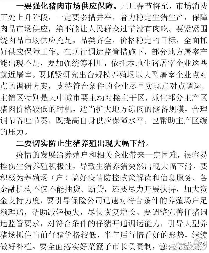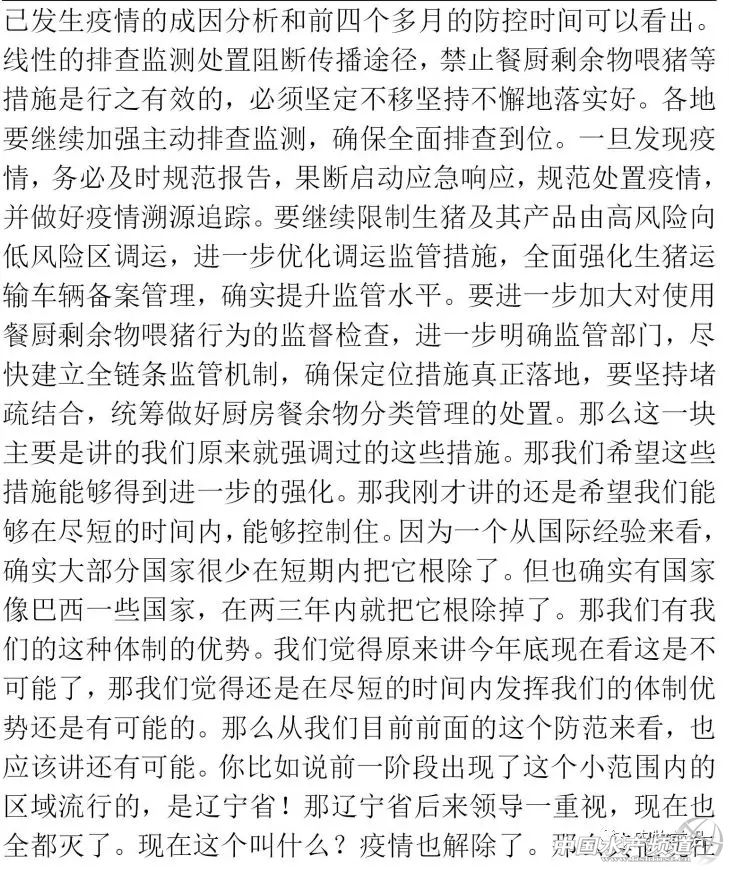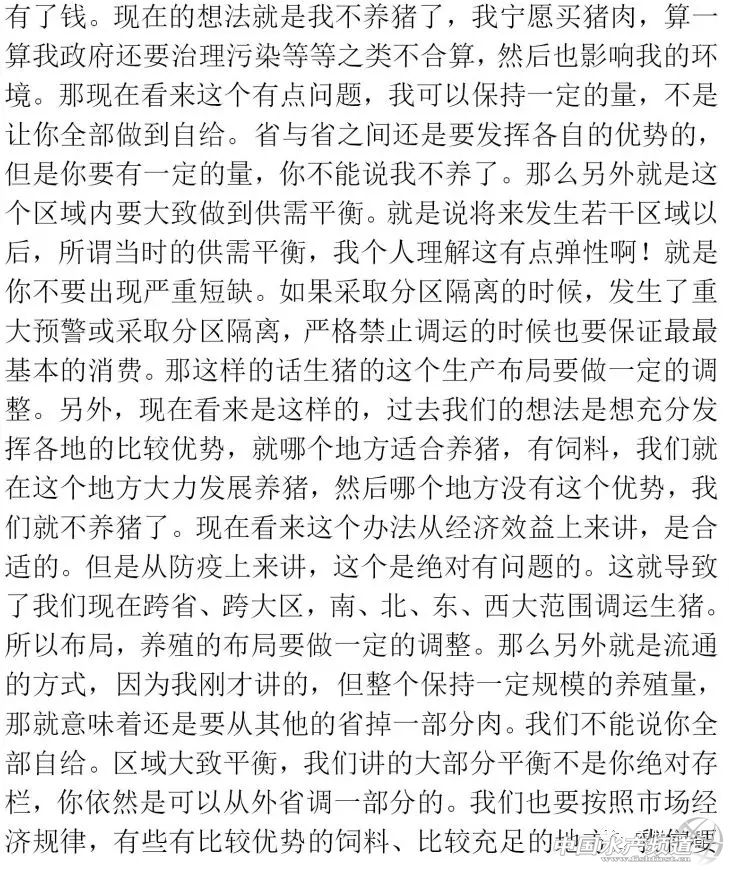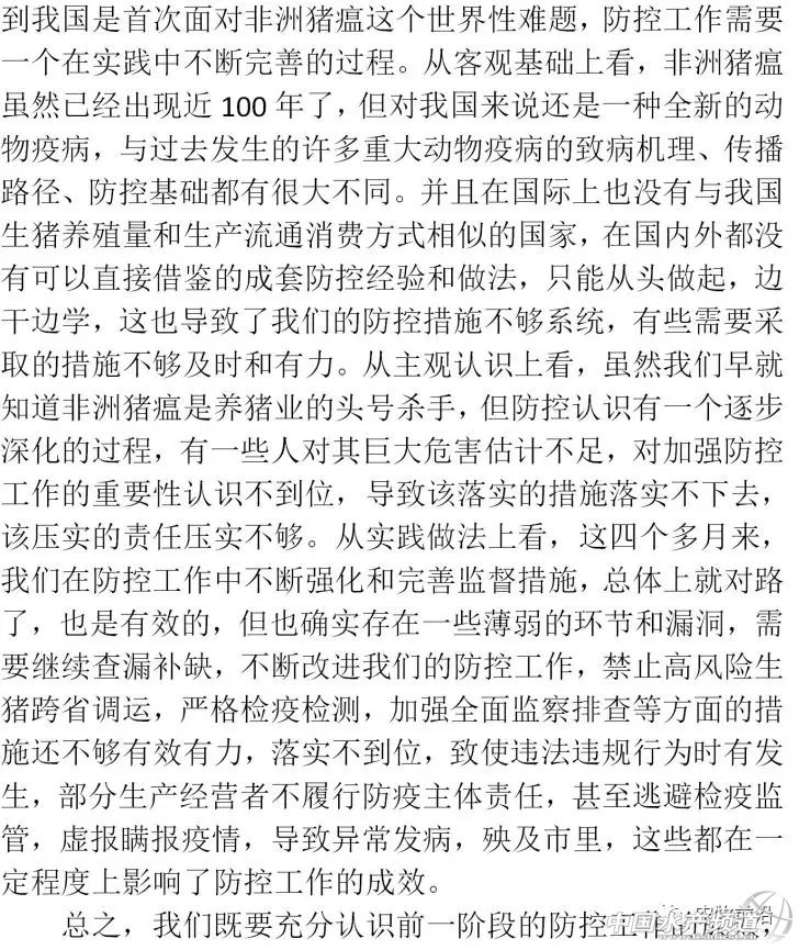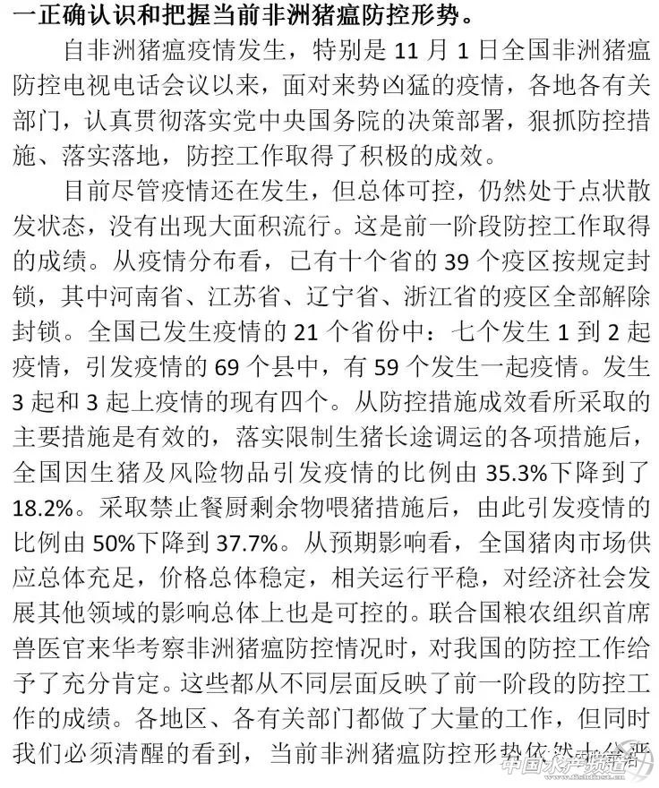 中國水產頻道原創報道, 文/農牧前沿綜合整理 12月11日,全國加強非洲豬瘟防控工作電視電話會議在北京召開。中共中央政治局委員、國務院副總理胡春華出席會議并講話。胡春華指出,當前非洲豬瘟防控形勢仍然十分嚴峻,任務十分艱巨,必須堅定防控信心,強化責任落實,全面加強防控工作。 農牧前沿也留意到,此次胡春華講話透露出幾個重大信息: 非洲豬瘟傳入我國時間可能是在今年6月份以前,甚至更早,且已經在部分地方形成一定病毒污染面,難以徹底根除。 非洲豬瘟在我國的流行情況復雜,隨著野豬疫情出現,更增添疫情傳播不確定性。 全國將全面實施分區防控,分區將不按行政省份劃分,按主產區與主銷區劃分,且各區內的產銷做到大致供需平衡。 南方及大中城市周邊地區要鼓勵建設高水平高質量的養殖企業,不能盲目禁養限養。 要鼓勵和支持大型養殖企業集團在省以內和同一個大區內布局全產業鏈,推行育、繁、養、宰、銷一體化的融合發展新格局。原則上就地屠宰變運豬為運肉,保障肉品供應穩定。 養殖布局要做一定的調整,從以前區域優勢角度考慮布局養殖到從防疫角度布局養殖。 禁止跨省調運活豬將是長期的措施。 要調整完善仔豬調運監管要求,對符合條件的仔豬開通調運能力。 以下為胡春華講話要點摘錄: 截止到12月10日,全國共21個省份發生了85起家豬疫情、兩起野豬疫情,嚴重威脅畜牧業生產安全。 從防控措施來看所采取的主要措施是有效的,落實限制生豬長途調運的各項措施后,全國因生豬及風險物品引發疫情比例由35.3%下降到了18.2%。采取禁止餐廚剩余物喂豬措施后,由此引發疫情的比例由50%下降到37.7%。 當前非洲豬瘟防控形勢依然十分嚴峻,任務十分艱巨。從非洲豬瘟自身特性看,該病潛伏周期長,生豬感染后最長在三周內都不表現出任何臨床狀態,但病毒可能在此期間通過多途徑擴散,幾乎是防不勝防。產銷區分離,生豬大多需要運往銷區屠宰,成為疫情擴撒的最主要方式。 病毒最初傳入我國的時間,可能是在今年6月份以前,甚至更早,并且極有可能是多次多點傳入。在沈陽首例疫情發現前,可能已經在部分地方形成一定的病毒污染面,根除難度很大。 野豬疫情的出現,意味著非洲豬瘟在我國的流行情況更加復雜,更增添了疫情傳播的不確定性。 我們既要充分認識前一段的防控工作的成效,更要正視下一步防控任務的艱巨性和復雜性。我們面臨的點狀發生恐怕很難在短期內消除,甚至從某種角度來講,有可能長期化。 嚴格落實現行各項關鍵防控措施。要繼續限制生豬及其產品由高風險向低風險區調運,進一步優化調運監管措施,全面強化生豬運輸車輛備案管理。 全面實施分區防控。綜合考慮區域相同動物防疫產銷互補等因素,將全國分成幾個動物防疫大區。不能簡單按照省級行政區來劃分。每個大區要明確一個牽頭的省份。 要調整優化生豬生產流通方式。科學規劃生豬養殖布局,各個省份保持一定規模養殖量,區域內要大致做到供需平衡,特別是南方及大中城市周邊地區,要鼓勵建設高水平高質量的養殖企業,確保一定的自給力,不能盲目的禁養限養,更不能一關了之、一棄了之。要鼓勵和支持大型養殖企業集團在省以內和同一個大區內布局全產業鏈,推行育、繁、養、宰、銷一體化的融合發展新格局。最大限度減少生豬長途調運,要切實加大屠宰產能布局調整,支持建設現代冷鮮肉品流通和配送體系,實現生豬出產區。原則上就地屠宰變運豬為運肉,保障肉品供應穩定。 各個省你們馬上要調查你們的豬肉來源情況,包括將來。主產區,你的豬肉主要銷往哪些區域?主銷區從哪些主產區調入豬肉,你將來不能漫天的到處去買。 我們要向國際學習,不要因為某一個省有了病,把整個行業全拖進去了,那就麻煩了。 過去我們的想法是充分發揮各地的優勢,哪個地方適合養豬,有飼料,我們就在這個地方大力發展養豬,哪個地方沒有這個優勢,我們就不養豬了。現在看來這個辦法從經濟效益上講是合適的,但從防疫上來講,是絕對有問題的。這就導致我們現在跨省、跨大區、南北東西大范圍調運生豬。所以養殖的布局要做一定的調整。 前一段時間的防控當中已經提出來了一個問題,就是禁止跨省調運活豬。我現在想告訴大家,這一個不是權宜之計,是長期的措施。大家要開始調整。 進一步加強動物的防疫科研攻關。要逐步建立完善產地檢疫和屠宰檢疫非洲豬瘟檢測出證制度,經檢測合格后方可出具檢疫證明。生豬屠宰場要配備檢疫人員和相應檢疫設備。 要堅持嚴防境外疫情傳入。 切實抓好豬肉市場供應和生豬產業的健康發展。一要強化豬肉市場供應保障。要抓緊研究出臺規模養殖場與大型屠宰企業點對點調研方案,支持符合條件的企業盡早實現點對點調運。二要切實防止生豬養殖出現大幅下滑。要積極為養殖場(戶)搞好疫情防控政策解讀和信息服務。各金融機構不僅不能抽貸斷貸,還要盡力開展扶持,加大資金支持力度,引導保險公司迅速對符合條件的養殖場戶足額理賠,幫助減輕損失,盡快恢復增長。要調整完善仔豬調運監管要求,對符合條件的仔豬開通調運能力。 以下是胡春華講話的完整記錄 非洲豬瘟對您的影響,歡迎您留言告訴我們。 轉載聲明 本文為“農牧前沿”獨家稿件 版權合作,敬請聯系wx fishfirst.cn 未獲書面許可,一