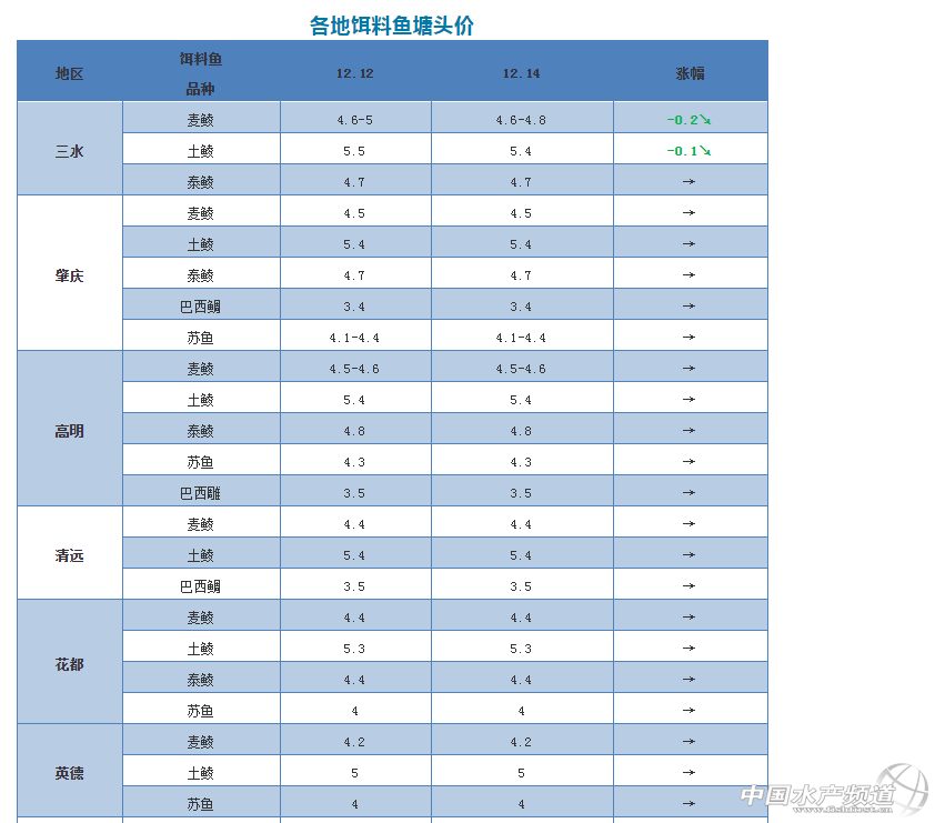 中國水產頻道原創報道, 元旦將至,鱖魚價格有望強勢反彈嗎? 文/圖 水產前沿 李靜 今天開始,各地氣溫逐漸有所回升。廣東入冬失敗,并且氣溫有望回升至20℃以上。除廣東外,其他產區目前出魚量依然不大,養戶觀望心理較強,尤其是江西、安徽地區,不少養戶計劃等到春節左右才出魚。最近出魚量極少,安徽標桂漲了0.5元/斤,當地最近也有人訂元旦左右出的標桂31元/斤。 近日,廣東鱖魚價格基本持穩,統貨今天最高訂29.2元/斤左右,以29元/斤的價格為主。據當地流通商反映,近日行情沒有起色,鱖魚價格上漲乏力,預計可能要到元旦才有好行情。 近日各地餌料魚價格持穩,部分地區略降。三水麥鯪、土鯪分別跌了0.1-0.2元/斤左右;江門麥鯪跌了0.3元/斤左右;中山土鯪跌了0.1元/斤左右;其他地區的價格暫時保持穩定。 雖然今年餌料魚價格整體偏高,但可喜的是,今年廣東鱖魚養殖消耗魚仔量有所下降,不少養戶4斤以下魚仔可養一斤魚,效益比預期要好。 視頻:今日江門養戶出魚,4畝多塘,放苗28000尾,出36000斤魚,平均1.3斤一條魚,29.5元一斤,餌料系數4.2。 |