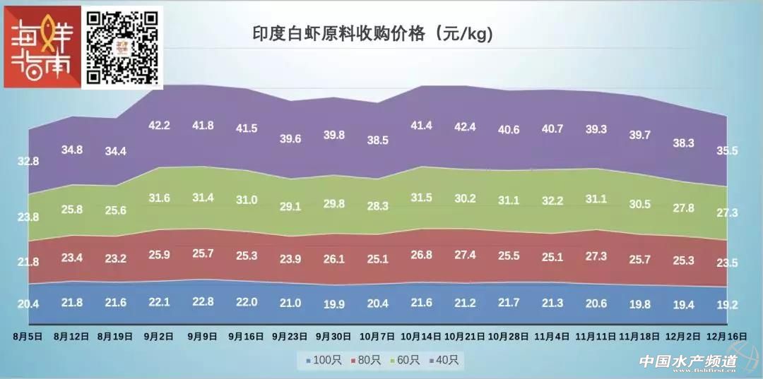 12月16日,印度100只/kg原料蝦2周降幅為0.2元/kg,80只/kg的降幅為1.8元/kg、60只/kg降幅為0.5元/公斤、40只/kg降幅高達2.8元/kg。