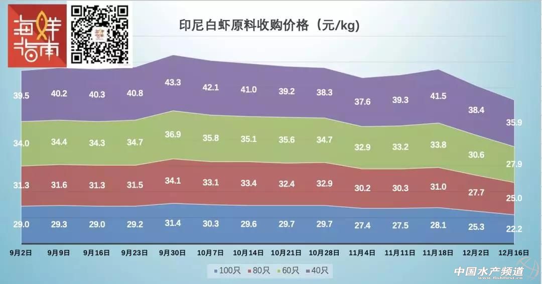 從下圖可以看出,12月16日,印尼100只/kg原料蝦2周降幅為2.8元/kg,80只/kg降幅為3.3元/kg、60只/kg降幅為3.2元/kg、40只/kg降幅為3.1元/kg。