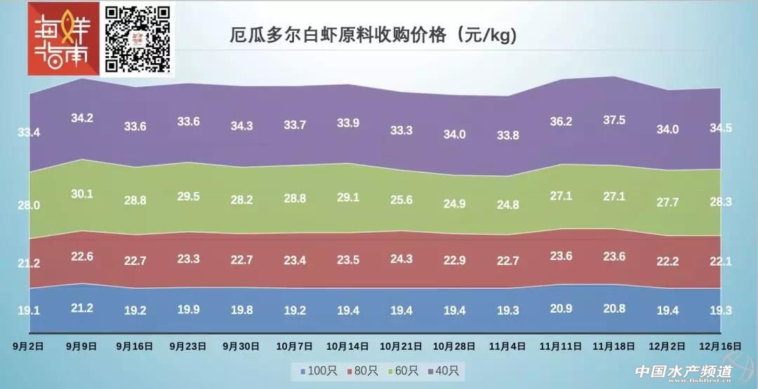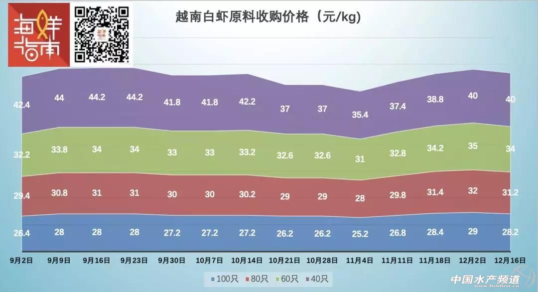 12月16日,100只/kg和80只/kg原料蝦2周以來基本保持平穩、60只/kg漲幅為0.5元/kg、40只/kg漲幅為0.5元/kg。
