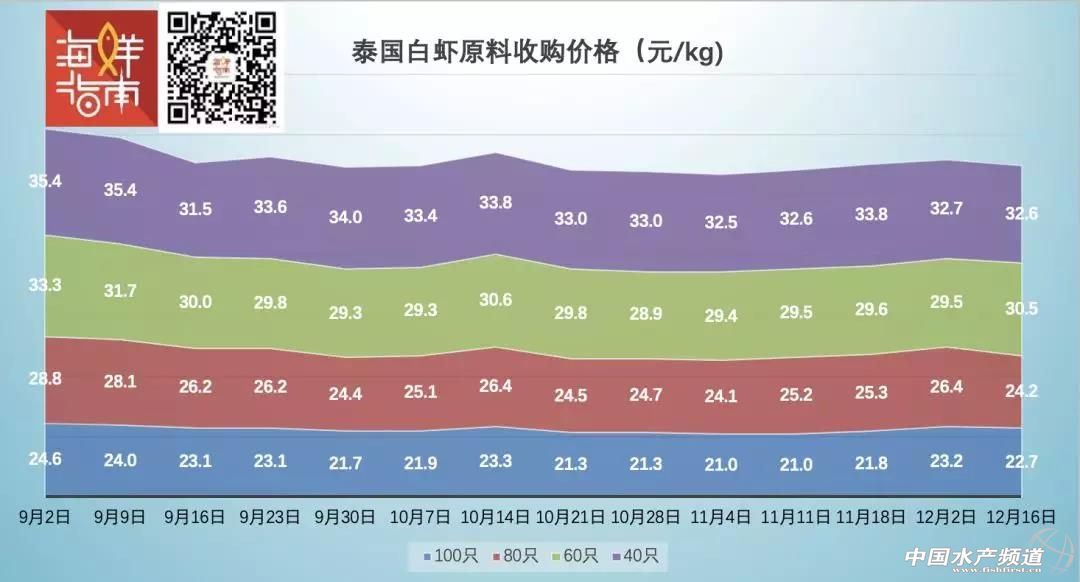12月16日,泰國100只/kg原料蝦2周降幅為0.5元/kg,80只/kg降幅為2.2元/kg、40只/kg價格降幅最小為0.1元/kg。60只/kg未降反升漲幅為1元/kg。