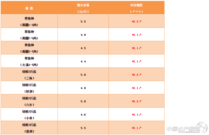 中國水產頻道原創報道,本周草魚價格繼續走高,統鯇和大草魚勢頭較好,草魚種小規格升價也比較快。草魚種2-5兩4.8元/斤,統鯇部分區域可以賣到5元/斤,都是比較理想的價格,大草魚目前價格一般,但是上升空間較大,脆肉鯇漲到13元/斤,利潤空間大,對大草魚的拉動會比較大!