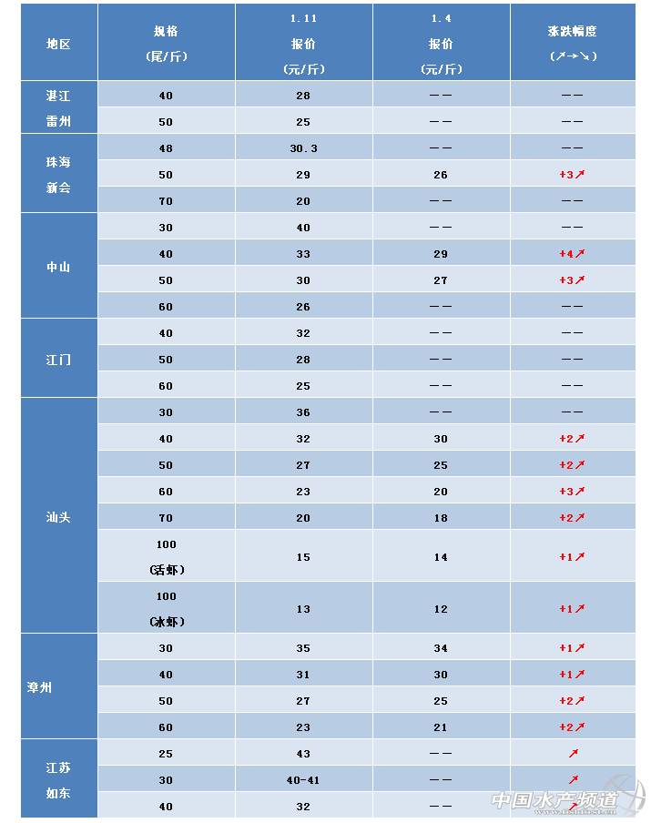 中國水產(chǎn)頻道原創(chuàng)報(bào)道,中山地區(qū)30頭規(guī)格蝦已達(dá)40元/斤! 文/ 水產(chǎn)前沿 植銀素 各產(chǎn)區(qū)白對蝦一周價(jià)格分析 湛江雷州:雷州目前主要是70-80條/斤以下規(guī)格較多。有個(gè)別蝦塘出現(xiàn)“黑腳病”的現(xiàn)象。 海南海口:存塘規(guī)格蝦少,暫停報(bào)價(jià)。 中山區(qū)域:30頭40元/斤,40頭33元/斤,50頭30元/斤,60頭26元/斤。白蝦白水塘已上市完畢,目前以冬棚蝦為主,市場棚蝦規(guī)格較細(xì),雖有上市,但量較少,蝦價(jià)上漲明顯。 珠海新會:40頭30.3元/斤,50頭29元/斤,70頭20元/斤。冬棚未有大量出蝦,病害較多,出蝦規(guī)格多為七、八十條,未來小蝦價(jià)格還會下低 廣西北海:存塘規(guī)格蝦少,暫停報(bào)價(jià)。 汕頭區(qū)域:本周蝦價(jià)30頭36元/斤,40頭32元/斤,50頭27元/斤,60頭23元/斤,70頭20元/斤,活蝦100頭15元/斤,冰蝦100頭13元/斤。高位池大規(guī)格蝦存塘量減少,養(yǎng)殖主要規(guī)格在30-100條。隨著溫度下降,池塘存塘蝦減少,蝦價(jià)逐漸提高。土塘大部分池塘清塘。本周蝦價(jià)格同比上周上漲1-3元/斤。 漳州區(qū)域:本周蝦價(jià)30頭35元/斤,40頭31元/斤,50頭27元/斤,60頭23元/斤。高位池大規(guī)格蝦的主要養(yǎng)殖規(guī)格在30-100條/斤,隨著近期天氣降溫,病害增加,排塘增加,存塘蝦減少。蝦存塘量減少,蝦價(jià)穩(wěn)步上漲,本周蝦價(jià)格同比上周上漲1-3元/斤。 江蘇如東:25頭43元/斤,30頭40-41元/斤,40頭32元/斤。存塘較少,蝦價(jià)持續(xù)小幅上漲,養(yǎng)戶惜售情況普遍。 上海地區(qū):上海市場已經(jīng)結(jié)束。 浙江紹興:紹興市場已經(jīng)結(jié)束。 【關(guān)鍵字】:對蝦價(jià)格 蝦價(jià) 塘頭價(jià)格 南美白對蝦 水產(chǎn)養(yǎng)殖 |