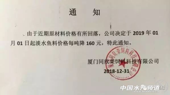 中國水產(chǎn)頻道獨(dú)家報(bào)道, 好消息!豆粕暴降之下,水產(chǎn)料降價(jià)的口子終于撕開! 文/ 中國水產(chǎn)頻道 去年10月中旬,豆粕的主流報(bào)價(jià)達(dá)到了年度最高點(diǎn),為3760元/噸,部分地區(qū)的價(jià)格已接近或突破4000元/噸。但受中美貿(mào)易戰(zhàn)緩解以及中國從多邊進(jìn)口大豆數(shù)量增多,全國畜禽水產(chǎn)禁養(yǎng)環(huán)保整頓,養(yǎng)殖業(yè)萎縮,最主要是養(yǎng)豬業(yè)受非洲豬瘟疫情蔓延,嚴(yán)重肆虐了全國等多重因素影響,豆粕需求量大幅下降,連鎖反應(yīng),其價(jià)格也一路下降。 2018年10月19日飼料原料報(bào)價(jià) 2019年1月11日飼料原料報(bào)價(jià) 據(jù)中國飼料行業(yè)信息網(wǎng)數(shù)據(jù)表示,至1月11日,主流豆粕報(bào)價(jià)最低跌至2870元/噸。并且目前臨近春節(jié),豆粕進(jìn)入更清冷的淡季,預(yù)計(jì)豆粕期價(jià)持續(xù)走跌,短線豆粕現(xiàn)貨也難轉(zhuǎn)強(qiáng),或在2650元/噸震蕩。 綜合上述,從去年10月最高價(jià),到新養(yǎng)殖旺季開展之前的低價(jià),豆粕的價(jià)格暴跌了1000多元/噸。今天,傳來了飼料公司明天零時(shí)下調(diào)料價(jià)消息。是恒興飼料和廈門同欣榮飼料等多家公司。具體如下: 福建恒興飼料有限公司降價(jià)通知 由于原材料價(jià)格下降,我公司從2019年1月14日零點(diǎn)起對(duì)以下品種降價(jià): 101(粉料,1.0)苗料降價(jià)80元/噸, 膨化羅非魚料(106,107,217,216)降價(jià)120元/噸, 膨化草魚料(803,805,225,223)系列、101(3.0)降價(jià)120元/噸, 顆粒草魚料221系列降價(jià)100元/噸。 廈門同欣榮飼料科技有限公司降價(jià)通知 福建漳州龍文塔飼料有限公司降價(jià)通知 從即日起下調(diào)膨化魚料,魚沉料,魚苗料從即日起到元月10日止每包優(yōu)惠4元。折合下調(diào)幅度為200元/噸 福建龍?zhí)╋暳嫌邢薰窘祪r(jià)通知 自2018年12月30日起,公司所有魚料系列全部下降2元每包。 恒興等多家公司已下降了水產(chǎn)飼料價(jià)格,下一個(gè)是哪家公司? |