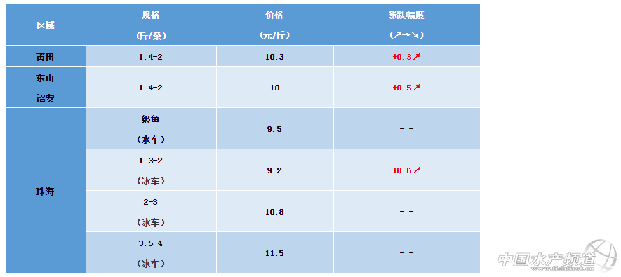 文/ 水產(chǎn)前沿 何鴻浩 中國水產(chǎn)頻道原創(chuàng)獨(dú)家報(bào)道,福建莆田、東山、詔安區(qū)域:鱸魚均已達(dá)到上市規(guī)格,存塘規(guī)格在1.5-2.2斤。福建地區(qū)鱸魚銷售主要活魚為主,隨著溫度下降,年底鱸魚市場需求有所增加,魚價(jià)明顯上漲,本周價(jià)格同比上周上漲0.3-1元/斤。 廣東珠海區(qū)域:現(xiàn)階段魚中集中打過年魚,養(yǎng)殖戶惜售,魚價(jià)高企 刺激養(yǎng)殖戶出魚,一天出魚量預(yù)計(jì)有80萬斤以上;目前天氣轉(zhuǎn)好,魚的吃料量增加;此外,魚苗價(jià)格持續(xù)高企,目前已經(jīng)漲到0.7元一尾,供不應(yīng)求,養(yǎng)殖戶都在等苗下。 ※上述報(bào)價(jià)可能會(huì)因區(qū)域、規(guī)格、品質(zhì)和時(shí)間等因素的不同而會(huì)產(chǎn)生差異,在此僅供參考。環(huán)比幅度以本周價(jià)格與上周價(jià)格數(shù)據(jù)做對(duì)比 【關(guān)鍵字】:海鱸 海鱸價(jià)格 水產(chǎn)養(yǎng)殖 |