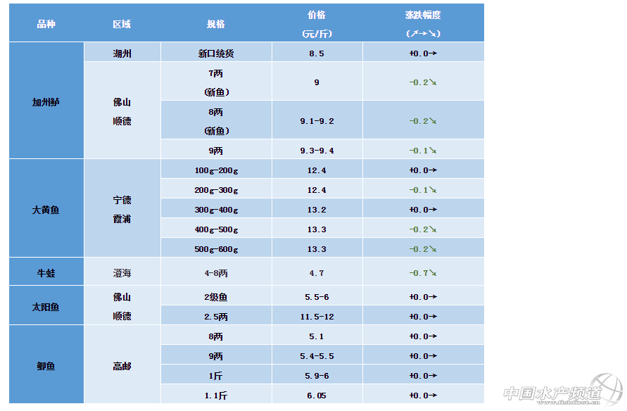 文/ 水產前沿 何鴻浩 中國水產頻道原創獨家報道,加州鱸:佛山地區:近期溫度低,出魚相對較少,新魚價格有所上漲;加州水花30-60元/萬,1萬口3-3.2分/尾,7-8朝3-3.5毛/尾,9-10朝4-6.5毛/尾,新魚價格看魚頭大小發價;近期加州價格低迷,很多養殖戶排隊出魚,超大規格魚砍價;氣溫下降,魚吃料減少,病害花身,水霉,諾卡氏,肝膽綜合征。湖州地區:目前湖州主要統貨出售,拉魚少,塘口存貨嚴重,近期價格進一步下跌,由于后市上市魚增多,預計后期價格仍會較低。 寧德、霞浦大黃魚:魚排存魚主要規格在0.8-1.4斤;大黃魚市場銷售緩慢存魚量多,市場價格持續低迷。本周大黃魚價格同比上周下跌0.2-0.3元/斤。 澄海牛蛙:牛蛙養殖規格均已達到上市規格,養殖主要規格在4兩-8兩。出蛙量增加,市場滯銷,蛙價低迷,同比上周下跌0.5-0.7元/斤。 順德太陽魚:近期主要病害為爛嘴爛身,出血。 ※上述報價可能會因區域、規格、品質和時間等因素的不同而會產生差異,在此僅供參考。環比幅度以本周價格與上周價格數據做對比 【關鍵字】:大黃魚 鯽魚價格 水產養殖 |
