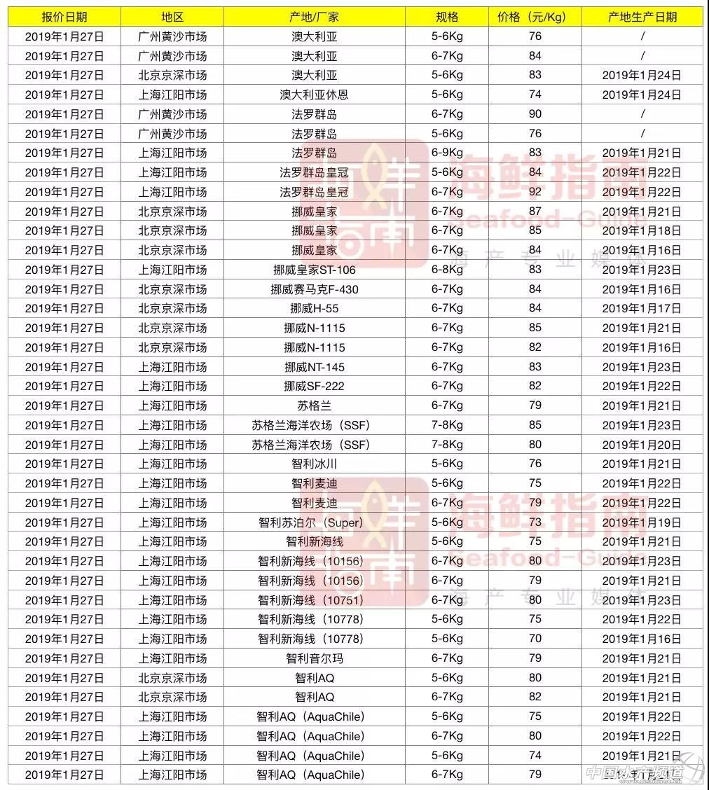 詳細(xì)報(bào)價(jià)見(jiàn)下圖(1月27日全國(guó)批發(fā)市場(chǎng)冰鮮三文魚(yú)報(bào)價(jià)): |
