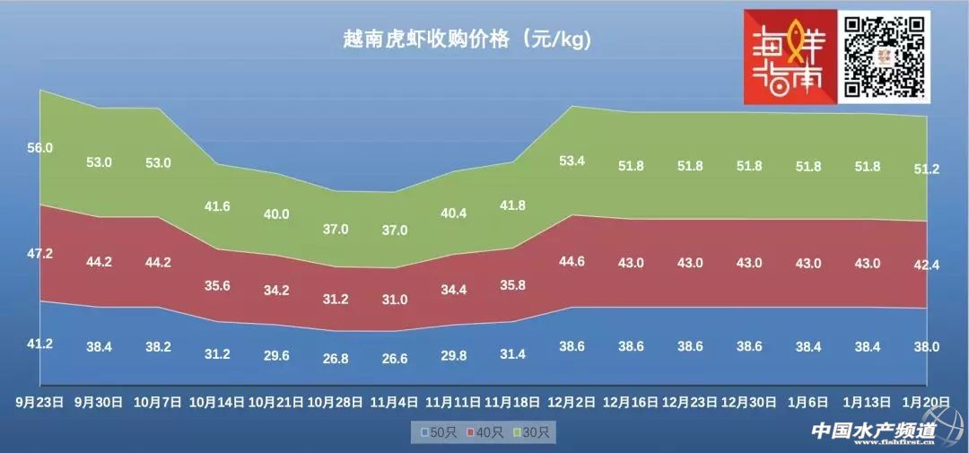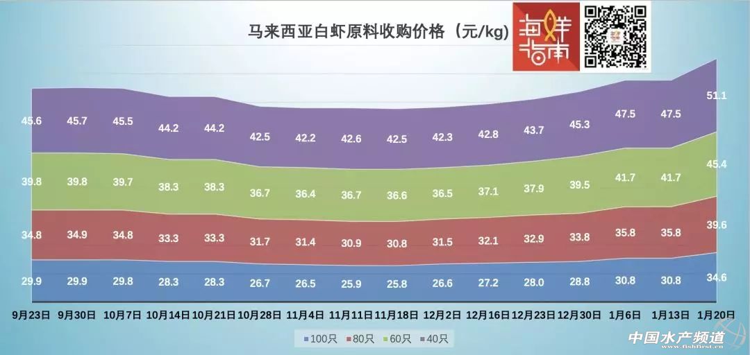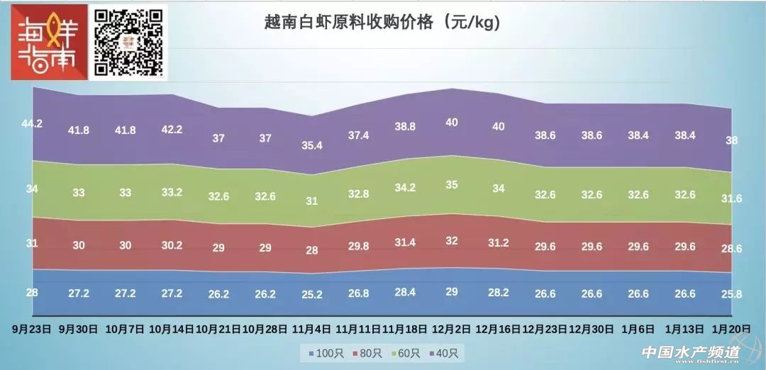 中國水產頻道原創報道, 文/圖 海鮮指南(seafood-guide) 張麗麗、陳磊 海外白蝦原料收購價格 本期(1月20日),泰國、馬來西亞白蝦收購價格繼續上漲,已連續升價一個月;印度、越南價格下跌明顯;厄瓜多爾、印尼漲跌幅度相對較小。 筆者分析:東南亞產區如泰國、馬來西亞等地白蝦收購價格大漲,主要是因為中國市場目前的厄瓜多爾白蝦現貨庫存已經無法滿足市場需求,但期貨又來不及趕在節前到港。因此,國內進口商轉為就近采購,從泰國馬來西亞等產地加緊補貨。相對集中的訂單推高了泰國、馬來西亞等地的原料蝦價。 漲跌詳情如下圖: 注:以上產品為當地蝦類的塘頭收購價,匯率按當地貨幣實時兌換人民幣計算 各產區原料蝦具體漲跌情況如下: 泰國原料蝦顯著上揚,已連漲四周,至全年最高價 1月20日,相較于上一周,泰國原料蝦價格繼續大幅上揚,從下圖可以看出蝦價已經連續上漲一個月。100只/kg原料蝦漲幅為0.7元/kg,80只/kg漲幅為1元/kg、60只/kg漲幅為2元/kg、40只/kg漲幅高達4.1元/kg,突破40元大關漲至全年最高價。 9月23日至1月20日泰國白蝦原料收購價格走勢(來源:海鮮指南) 厄瓜多爾白蝦原料小規格下滑、大規格上漲 1月20日,相較于上一周,厄瓜多爾白蝦小規格下跌、大規格上漲。100只/kg原料蝦降幅為0.2元/kg,80只/kg降幅為0.3元/kg、60只/kg漲幅為0.4元/kg、40只/kg漲幅最大為1.6元/kg。 9月23日至1月20日厄瓜多爾白蝦原料收購價格走勢(來源:海鮮指南) 越南原料蝦價下跌 1月20日,相較于上一周,越南原料蝦價明顯下跌。100只/kg原料蝦降幅為0.8元/kg,80只/kg降幅為1元/kg、60只/kg降幅為1元/kg、40只/kg降幅較小為0.4元/kg。 9月23日至1月20日越南白蝦原料收購價格走勢(來源:海鮮指南) 印度白蝦收購價格明顯下跌,40規格跌幅最大 1月20日,相較于上一周,印度原料蝦明顯下跌,100只/kg降幅為1.7元/kg,80只/kg的價格下滑降幅為1.3元/kg、60只/kg降幅為1.9元/公斤、40只/kg降幅高達3.3元/kg。 9月23日至1月20日印度白蝦原料收購價格走勢(來源:海鮮指南) 印尼大規格蝦價上漲 從下圖可以看出,1月20日,印尼白蝦收購價格相對平穩,各規格回落幅度不超過0.2元/kg。 9月23日至1月20日印尼白蝦原料收購價格走勢(來源:海鮮指南) 馬來西亞原料蝦價格大漲,平均漲幅3.6-3.8元 1月20日,馬來西亞各規格原料蝦價格大漲。100只/kg原料蝦漲幅為3.8元/kg;80只/kg漲幅為3.8元/kg;60只/kg漲幅為3.7元/kg;40只/kg漲幅為3.6元/kg,突破50元/kg大關,漲至全年最高價。 9月23日至1月20日馬來西亞白蝦原料收購價格走勢(來源:海鮮指南) 海外虎蝦收購價格行情 1月20日,越南虎蝦(草蝦)價格相對平穩,略有回落,降幅在0.4-0.6元/kg。 9月23日至1月20日越南虎蝦(草蝦)收購價格走勢(來源:海鮮指南) 1月20日,馬來西亞虎蝦(草蝦)價格回升,50只/kg漲幅為1.3元/kg、40只/kg漲幅為1.2元/kg、40只/kg漲幅為1.1元/kg。 9月23日至1月20日馬來西亞虎蝦(草蝦)收購價格走勢(來源:海鮮指南) |