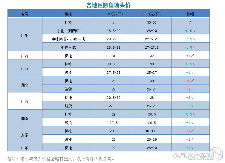 中國水產(chǎn)頻道原創(chuàng)報道,預計隨著這輪年前出魚高峰結(jié)束,年后鱖魚價格有望慢慢回升。 文/圖 水產(chǎn)前沿 李靜 這兩日,隨著春節(jié)臨近,各地標桂銷量明顯增長,鱖魚行情現(xiàn)回暖趨勢。 各產(chǎn)區(qū)鱖魚價格大致如下:廣東標桂30-31元/斤左右,中桂一到兩成小魚統(tǒng)貨28-29元/斤左右,中桂兩成、小魚一成27.5-28元/斤左右,中桂三成27-27.5元/斤左右;廣西標桂32元/斤左右;江蘇標桂30元/斤左右,統(tǒng)貨25-27元/斤左右;湖北標桂30元/斤左右,統(tǒng)貨26-27元/斤左右;江西標桂28元/斤左右,統(tǒng)貨26-27元/斤左右;湖南標桂28.5元/斤左右,統(tǒng)貨26.5元/斤左右;安徽標桂30-30.5元/斤左右,統(tǒng)貨28-29元/斤左右;山東標桂28-29元/斤左右。(以上價格僅供參考) 2018年下半年,廣東鱖魚價格漲跌起伏不定,坐了幾輪過山車,但整體價格高于2017年同期,直到2019年1月,市場偏大魚滯銷,又趕上養(yǎng)殖戶扎堆出魚,鱖魚價格不漲反跌至28-29元/斤,比去年同期統(tǒng)貨30.5元/斤低了2.5元/斤左右。但預計隨著這輪年前出魚高峰結(jié)束,年后鱖魚價格或許會慢慢回升。 圖:紅色為近半年(8月-1月)廣東鱖魚價格走勢,藍色為去年同期價格走勢 1月份,隨著氣溫回升,大部分地區(qū)的餌料魚價格漲勢明顯,最高漲0.7元/斤。三水麥鯪和泰鯪分別漲了0.3-0.5元/斤;肇慶土鯪、巴西雕約漲了0.5-0.6元/斤;高明麥鯪、土鯪、泰鯪、巴西雕分別漲了0.1-0.4元/斤;清遠麥鯪、巴西雕漲了0.2-0.5元/斤;花都麥鯪、土鯪、泰鯪等分別漲了0.1-0.2元/斤;江門麥鯪漲了0.7元/斤左右;順德土鯪漲了0.3元/斤左右。 |