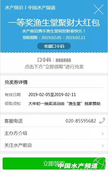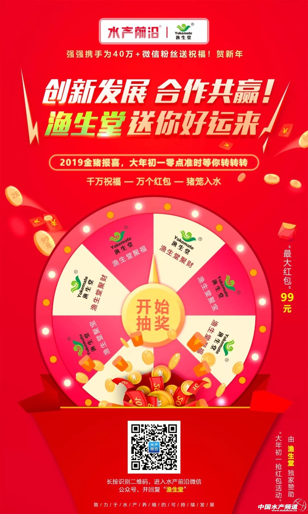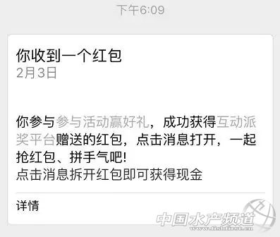 中國水產(chǎn)頻道原創(chuàng)報(bào)道, 張燈結(jié)彩,喜氣洋洋! 歡慶鑼鼓,熱鬧鞭炮! 相互守候,美好祝福! 春節(jié)——中國人最高的儀式感 2019年就在今天恣意綻放 中國水產(chǎn)第一媒體——水產(chǎn)前沿公眾號(hào)攜手好潤生物、漁生堂在大年三十和大年初一為40萬+粉絲助興新春大派萬個(gè)紅包!圍爐在家,相約父母、相約寶貝、相約親愛的一起動(dòng)動(dòng)手指頭,隨時(shí)隨地玩贏“豬籠入水”——好運(yùn)大轉(zhuǎn)盤。 祈禱新的一年風(fēng)調(diào)雨順 魚蝦滿塘、豬籠入水! 高能預(yù)警 第二波大紅包 大年初一零時(shí)(0:00)準(zhǔn)點(diǎn) 鎖定水產(chǎn)前沿公眾號(hào) 由漁生堂獨(dú)家贊助 紅包派不停! 創(chuàng)新發(fā)展 合作共贏!漁生堂送你好運(yùn)來! 千萬祝福——萬個(gè)紅包——豬籠入水 最高99元/個(gè) 動(dòng)動(dòng)手指頭,驚喜多多 大 拜 年 辭舊迎新豬年大吉!天津市漁生堂生物技術(shù)有限公司感謝所有朋友的信任和支持,我們將不忘初心,砥礪前行!未來不斷推陳出新,繼續(xù)全力服務(wù)水產(chǎn)養(yǎng)殖事業(yè)。祝福廣大養(yǎng)殖戶和水產(chǎn)同仁們?cè)?019年里,收獲滿滿,福氣多多,順順利利! 如何玩贏 “豬籠入水”——好運(yùn)大轉(zhuǎn)盤 看這里! 活動(dòng)時(shí)間 2月5日,大年初一零時(shí)準(zhǔn)點(diǎn) 活動(dòng)獎(jiǎng)品 千萬祝福——萬個(gè)紅包!最大紅包99元! 參與方式 第一步:長按識(shí)別下方二維碼關(guān)注“水產(chǎn)前沿”微信公眾號(hào) 第二步:消息對(duì)話框回復(fù)關(guān)鍵詞“漁生堂”,點(diǎn)擊鏈接進(jìn)入游戲大抽獎(jiǎng) 第三步:中獎(jiǎng)幸運(yùn)兒根據(jù)提示領(lǐng)取紅包 查看獎(jiǎng)品詳情點(diǎn)擊“立即領(lǐng)取”按鈕,領(lǐng)取紅包 注意!此處領(lǐng)取成功后,該微信紅包將通過公眾號(hào)列表中的服務(wù)通知推送領(lǐng)取消息,最后送到您的微信錢包! 【本活動(dòng)最終解釋權(quán)歸水產(chǎn)前沿雜志、中國水產(chǎn)頻道所有】 四大媒體同慶 敲黑板,劃重點(diǎn)!除了水產(chǎn)前沿公眾號(hào),你還可以在 工業(yè)化水產(chǎn)圈 鱖鱸前沿 農(nóng)牧前沿 等優(yōu)秀公眾號(hào)上參與玩贏“豬籠入水”——好運(yùn)大轉(zhuǎn)盤!紅包多多,歡樂多多! 大 吉 識(shí)別下方二維碼或關(guān)注 【工業(yè)化水產(chǎn)圈】 回復(fù)“漁生堂” (溫馨提醒!是在公眾號(hào)打開頁面對(duì)話框回復(fù),不是在本文文末回復(fù)) 即可參與“豬籠入水”——好運(yùn)大轉(zhuǎn)盤抽獎(jiǎng) 大 吉 識(shí)別下方二維碼或關(guān)注 【鱖鱸前沿】 回復(fù)“漁生堂” (溫馨提醒!是在公眾號(hào)打開頁面對(duì)話框回復(fù),不是在本文文末回復(fù)) 即可參與“豬籠入水”——好運(yùn)大轉(zhuǎn)盤抽獎(jiǎng) 大 吉 識(shí)別下方二維碼或關(guān)注 【農(nóng)牧前沿】 回復(fù)“漁生堂” (溫馨提醒!是在公眾號(hào)打開頁面對(duì)話框回復(fù),不是在本文文末回復(fù)) 即可參與“豬籠入水”——好運(yùn)大轉(zhuǎn)盤抽獎(jiǎng) 等等等,過年喜事要成雙! 還有一件高興的事別忘了 除夕(今天)晚上8:08 第一波大紅包首先高能來襲 鎖定水產(chǎn)前沿公眾號(hào) 由好潤生物獨(dú)家贊助 先派萬個(gè)紅包,最高99元/個(gè) 不容錯(cuò)過 動(dòng)動(dòng)手指頭,紅包派到手,詳情點(diǎn)擊: 豬籠入水,好潤好運(yùn)!最高99元/個(gè)!大年三十水產(chǎn)前沿?cái)y手好潤,萬個(gè)紅包派不停 新年小貼士 豬籠入水:比喻財(cái)源廣進(jìn)。因?yàn)樨i籠是空網(wǎng)狀的,放水中,水即滾滾而來,而“水”為財(cái)意。“豬籠入水”是一句大吉大利的祝愿之詞。 【關(guān)鍵字】:好潤生物 漁生堂 微信大紅包 水產(chǎn)養(yǎng)殖 |