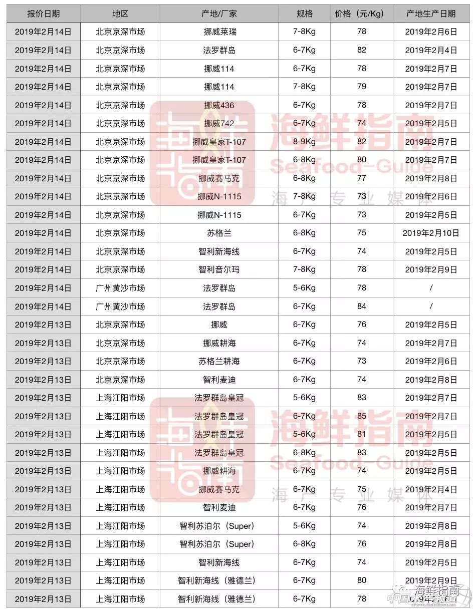 | 中國水產頻道原創報道, 文/ 海鮮指南(seafood-guide)沈基文 2018年1月至12月智利三文魚(含大西洋鮭和虹鱒)出口數據顯示,過去的2018年共出口了631687噸,即比2017年的523038噸增加了20.8%。 就市場而言,美國仍然是智利三文魚(含大西洋鮭和虹鱒)最重要的市場,共169663噸(同比2017年增長 21.2%),其次是日本的142960噸(同比2017年增長 18.5%)和巴西87082噸(同比2017年增長8.4%)。 公開數據顯示,中國是2018年智利三文魚(含大西洋鮭和虹鱒)增長最快的市場。 具體而言,智利2018年共出口了42506噸三文魚(含大西洋鮭和虹鱒)到中國,增速53.2%,其中大西洋鮭出口量占了92.1%,達到39148噸。 2018年,智利大西洋鮭出口到中國前三的單體品牌是智利蘇泊爾、智利賽馬克和智利麥迪,分別占比17.9%、13.5%和12.2%。如果將智利新海線納入計算的話,智利新海線出口到中國的數量是智利三文魚(不含虹鱒)出口量首位。 聲明: 1、本文所提三文魚均指大西洋鮭; 2、報價均為進口商批發價,與零售/餐飲/酒店渠道報價不相等,請勿對號入座。 詳細報價見下圖(2月13-14日全國批發市場冰鮮三文魚報價): |