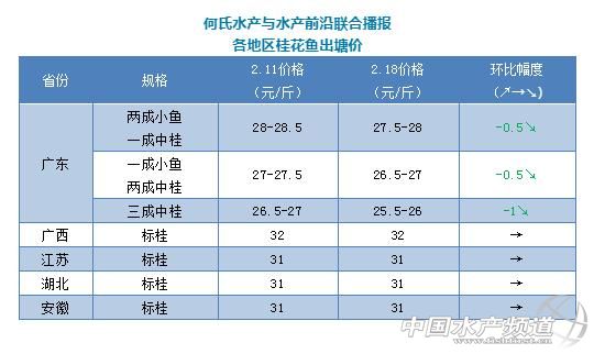 | 中國水產頻道原創報道, 文/圖 何氏水產、水產前沿 李靜 今天大部分學生已開學,雖然明天才是元宵節,但水產界的春節好行情前幾天已經結束了。本周廣東桂魚開塘價下滑了0.5-1元/斤,銷量也下降到節前水平。外省四大產區的標桂價格暫時與上周一樣,銷量下滑。 廣東桂魚本周價格與上周相比基本都下跌了0.5-1元/斤,特別是偏大規格的魚下跌幅度更大。現在最好規格的魚(7-8成標桂)價格最高訂到28元/斤,現在大部分成交價在26-27.5元/斤為主,主要看實際規格和出魚時間來定價。本周開始,市場行情特別不好,市場價格下跌,銷量下滑,特別是偏大魚的行情更不好,價格更低,銷量更少。預測接下來桂魚開塘價格還會有小幅的下滑,銷量也會下降。 廣西、江蘇、湖北、安徽四大主產區的標桂價格暫時穩定,因為標桂出塘量還不是太多,主要是偏大魚比例多,所以中大魚價格也有一定程度的下跌。預計接下來標桂價格也會有小幅下滑,銷量恢復到節前水平。 |