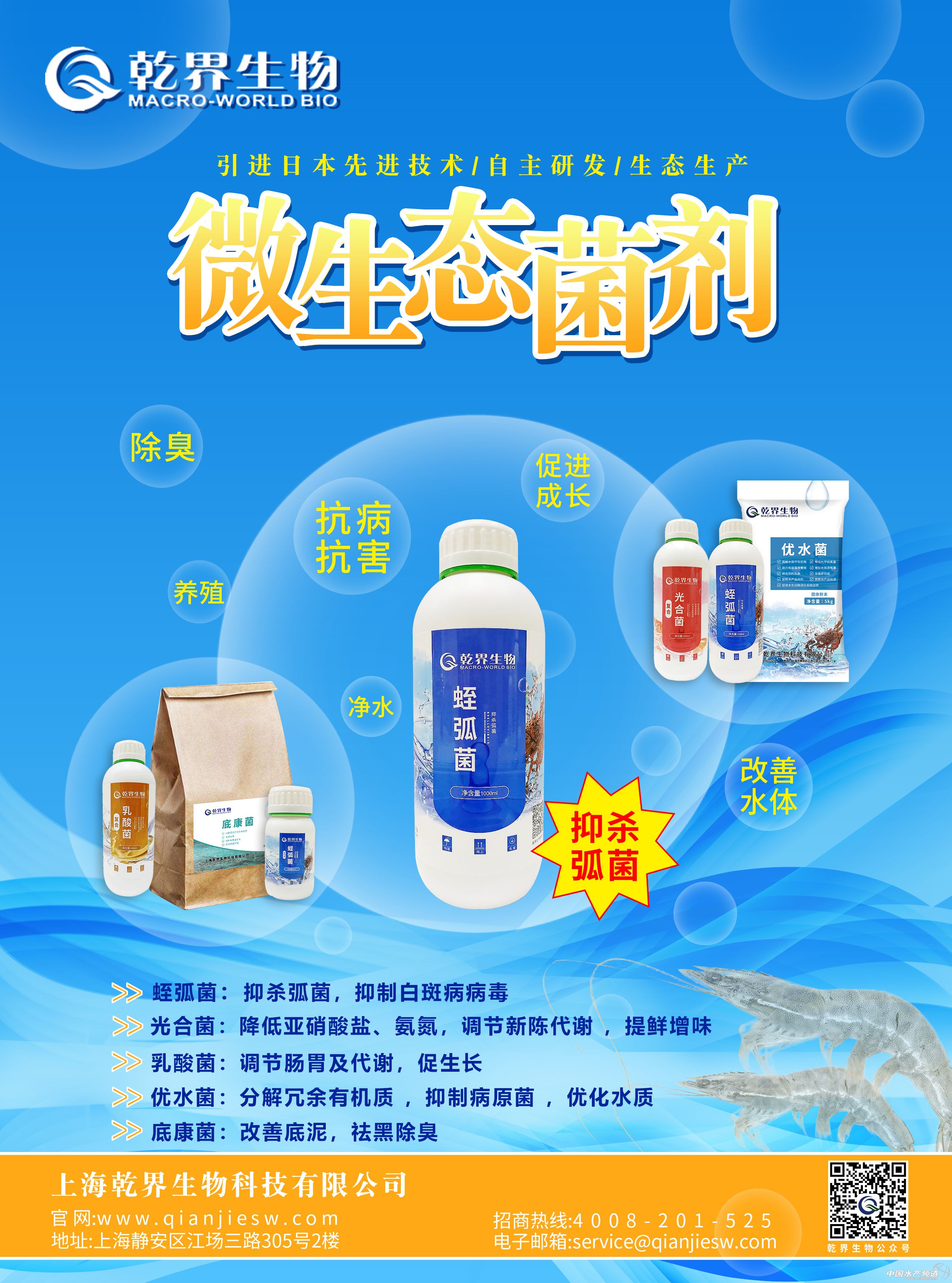 中國水產頻道獨家報道, 全球水產養殖的重心在中國,而南京,則是中國水產養殖業的地理中心。以南京為中心,飛機2小時范圍,覆蓋了整個中國沿海與沿長江水產養殖核心區;高鐵3小時范圍可覆蓋江蘇、浙江、安徽、山東、江西、湖北,這個區域,也正是中國水產養殖業發展潛力最大的華東、華中區域,海水、淡水與特種水產養殖兼備,工業化也走在中國最前沿。 中國的水產養殖業,歷經40年高速發展,2018年開始,在環保風暴、消費升級與全球競爭的合力下,正式進入全面轉型,可持續與產業升級成為方向,工業化、深海、傳統池塘升級、養殖品種升級,正在逐一落地。 “中國水產前沿展”的使命:聚集中國主流水產養殖者以及全球領先企業、前沿產品、務實解決方案,成為中國水產養殖高手與全球前沿的專家,領先的飼料、種苗、設備、動保等支撐體系的年度交流與對話平臺。 2019’中國水產前沿展 China aquaculture expo 2019 主辦 水產前沿 中國水產頻道 媒體 海鮮指南 農牧前沿 工業化水產圈 鱖鱸前沿 今日頭條 網易新聞 承辦 廣州靈獅廣告有限公司 時間 | 地點 2019·3·30-31 南京國際博覽中心2號館 展會亮點 -覆蓋中國特種水產養殖品種最集中的區域:中國河蟹、小龍蝦、對蝦、羅氏蝦、青蝦、鯽魚的主產區;加州鱸、鱖魚的最大新興產區;水產動保、功能性水產飼料、水產膨化飼料的最大新興市場; -全球領先的種苗、設備、動保、飼料企業集中呈現; -匯集全國水產養殖高手、主流經銷商。 組委會聯系方式 揭小麗 13719331127 劉 欣 13728001916 陳藝丹 18024037063 彭曉君 13809826267 3月28-31日誠摯邀請水產行業同仁參展參觀交流! 【展商推薦】v004-1上海乾界生物科技有限公司水產事業部 企業簡介 上海乾界生物科技有限公司水產事業部,是一家集研發、實驗、生產、銷售、服務為一體的漁用微生物產品的企業。公司以世界領先的日本微生物技術為原動力,依托強大的自主研發和落地實力,豐富的客戶使用和實踐為基礎,在水質調控、病害防治、促進生產方面不斷推出滿足快速發展的水產養殖核心競爭力的產品。 基于水產養殖行業的現狀和需要,針對不同的品種、養殖水體差異、病害的多樣性,乾界生物提出了公司的價值主張即4RS理念:恰當的產品,恰當的用量,恰當的時間,恰當的地方,針對性的提供解決方案和技術支持。努力讓生產更輕松,讓食品更安全,讓環境更美好! 我們熱愛水產,立足水產,專注水產藥品,以市場為導向,以品質為保證, 堅持科技創新,倡導使用技術,推崇服務至上, 發揮在技術開發和拓展上的優勢,不斷的打磨和提升我們的核心競爭力,為廣大水產養殖業者優質的產品和完善的服務。 企業產品 |