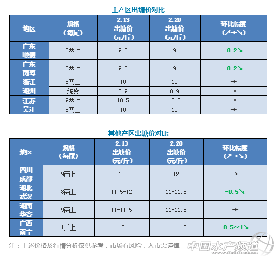 | 中國水產頻道原創報道, 文/圖 杰大飼料 水產前沿 李曉欣 聯合發布 元宵已過,至此春節算是真正意義上地過完了。受節后銷量減少影響,本周產區加州鱸塘頭價穩中有降,其中廣東佛山8兩上加州鱸下跌了0.2元/斤,湖北武漢下跌了0.5元/斤,廣西南寧下跌了0.5-1元/斤,其他產區加州鱸塘頭價基本持穩。 隨著氣溫逐漸回升,近期佛山地區清塘準備育苗的養戶增多,當地迎來放水花高峰期。據悉,目前各加州鱸苗場的水花產量都比較大,水花價格在20-30元/萬尾左右。 今日各地加州鱸塘頭價及本周行情分析 廣東順德:今天報價8兩上9元/斤左右,實際成交價根據魚規格大小有所浮動,節后魚價相比上周略有調整。春節前當地養戶該出魚的都已經出了,本周出魚量有所減少,除了準備清塘的養殖戶會連續出魚。近期趕著清塘的養殖戶比較多,部分地區迎來放水花高峰期。 廣東南海:今天報價8兩上9元/斤左右,實際價格看上車規格略有浮動。目前市場對8兩上規格的魚需求較大,8兩以下相對較少。近來魚價較為低迷,加上南海區域是養舊魚的模式,目前養戶出魚積極性很低。 浙江湖州:今天報價8兩上10元/斤,統貨是8-9元/斤,魚價變動不大。目前該地區還是以出統貨為主,近期養殖戶出魚積極性比較高,因為需要清空魚塘為開春標苗做準備。 江蘇吳江:吳江鱸魚價格持穩已久,8兩上報價10元/斤,9兩上報價10.5元/斤。按照目前這個價格,吳江養殖戶出魚積極性不高,流通商大多到附近的湖州地區或者南下到廣東收魚,預測近期標魚價格變動不大。 四川成都:今天報價9兩上12元/斤,與上周持平。當地部分養殖戶想趕在魚產卵前多出一網魚,所以目前出魚積極性還比較高。 湖北武漢:今天武漢9兩上加州鱸塘頭價11-11.5元/斤左右,相比上周價格下跌了0.5元/斤,主要是受節后銷量減少影響。目前武漢當地存魚達上市規格的不多,養戶出魚積極性不高,預計后市魚價或會小幅上漲。 湖南華容:今天華容9兩上加州鱸報價11-11.5元/斤,魚價相比上周持平。由于魚價未達預期,當地養戶出魚意愿不大,走量回落到節前水平。 廣西南寧:今天南寧1斤以上加州鱸報價11-11.5元/斤,相比上周價格下跌了0.5-1元/斤,主要是受節后銷量減少影響。 |