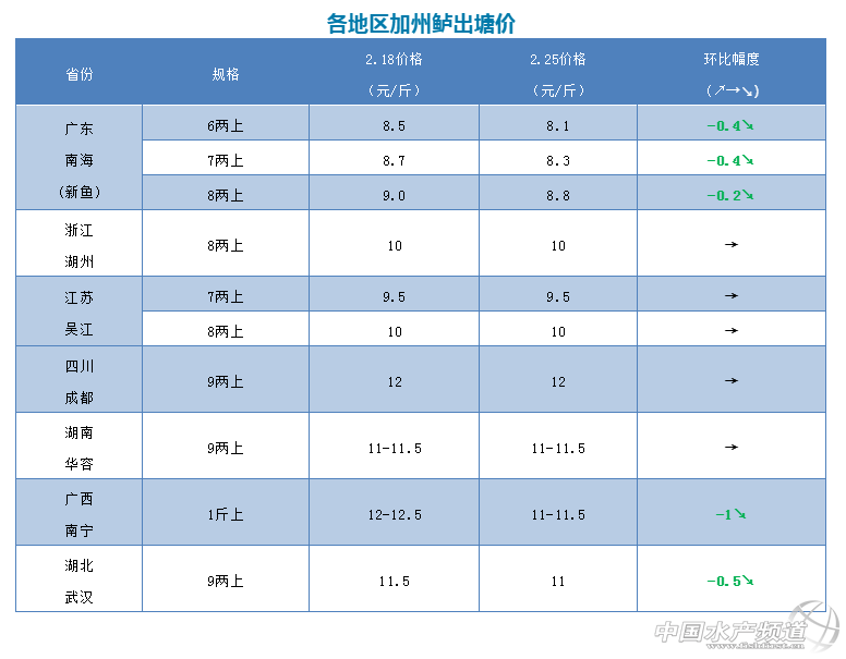 | 中國水產頻道原創報道, 文/圖 何氏水產、水產前沿 李靜 真是虧到心極痛!魚市行情陷跌價風暴,持續爛市。不但大宗養殖魚類如草魚、鯽魚、鯉魚價格暴跌,特種魚類如鱖魚、加州鱸、生魚等跌得更兇猛。在上周量價齊跌的基礎上,本周鱖魚最高再跌2元/斤,加州鱸最高再跌1元/斤,不但價格大降,兩條魚的銷量也呈大幅下跌。生魚銷量稍穩定,但價格仍止不住地跌,絕大部分人跌破成本。 不少業內人士無奈地驚嘆甚至震驚,全國大江南北魚價幾近全線暴跌,涉及品種之多持續時間之久下跌幅度之大,為20多年來罕見的現象。而何止魚價才能回暖反彈?目前,雖然廣東地區黃顙魚仍持續低迷行情,量價還在跌,但浙江、湖北地區市場已出現回暖,價格有所上揚,最高漲了0.5元/斤。另外生魚銷量企穩,上周部分地區對蝦價格現喜人上漲,如汕頭地區一周內漲了8元/斤,中山地區最高漲3元/斤,還有湛江也小幅漲。 那么,這些品種的表現是不是預示低迷已久的行情要回暖了呢?讓我們一起祈愿吧! 加州鱸 一覽全國加州鱸行情,廣東產區的價格本周持續下跌0.2-0.4元/斤,廣西南寧、湖北武漢兩地受到廣東持續掉價的影響本周價格也下滑了0.5-1元/斤。其他產區的價格與上周基本一樣,全國市場行情都不好,銷量下跌。 1、廣東鱸魚本周開塘價下跌了0.2-0.4元/斤,6兩以上8.1元/斤,7兩以上8.3元/斤,8兩以上8.8元/斤,最終成交價還是看魚頭、質量以及8兩以上的比例來定價的。春節過后,受到節后效應的影響行情不好,銷量直線下滑。現在鱸魚的存塘量還很多,大部分養戶都需要清塘放苗,出魚積極性高漲,都在排隊出魚,按目前態勢下,價格上漲機會不大,銷量也會穩定。 2、浙江湖州新魚還是出統貨為主,8兩以上成交價還是10元/斤,統貨價格8-9元/斤,這個價格已經維持很久,現在養戶出魚積極性不高,上周銷量持續下降。本周江蘇吳江價格還是不變,7兩以上還是9.5元/斤,8兩以上還是10元/斤,價格持穩兩個多月了,出魚量下跌,收購商到浙江湖州拉魚比較多,預測接下來價格還會持穩,本周銷量比上周少。廣西南寧、湖北武漢兩地受到廣東持續掉價的影響本周價格也下滑了0.5-1元/斤。其他產區的價格與上周基本一樣,全國市場行情都不好,銷量下跌。 |