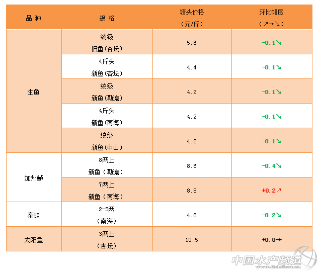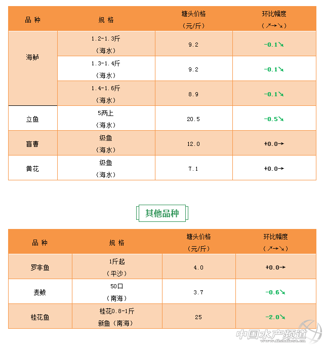 | 中國(guó)水產(chǎn)頻道原創(chuàng)報(bào)道, 文/ 珠海海龍 水產(chǎn)前沿 吳佳輝 海水特種魚(yú):海鱸級(jí)魚(yú)和中魚(yú)后市看穩(wěn) 鱸魚(yú):級(jí)魚(yú)及中魚(yú)受需求影響,價(jià)格微跌,后市看穩(wěn)。 立魚(yú): 珠海斗門(mén):較上周魚(yú)價(jià)有所回落,整體魚(yú)價(jià)都降低0.5元一斤。 珠海小林:市場(chǎng)抓魚(yú)規(guī)格偏大,價(jià)格略有下行,預(yù)計(jì)后期價(jià)格穩(wěn)定。 盲曹:統(tǒng)級(jí)11元/斤。 黃花:目前存塘少,受市場(chǎng)流通影響需求小,后期波動(dòng)不大。 |
