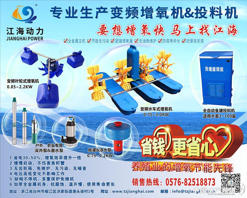 | 中國水產頻道獨家報道, 全球水產養(yǎng)殖的重心在中國,而南京,則是中國水產養(yǎng)殖業(yè)的地理中心。以南京為中心,飛機2小時范圍,覆蓋了整個中國沿海與沿長江水產養(yǎng)殖核心區(qū);高鐵3小時范圍可覆蓋江蘇、浙江、安徽、山東、江西、湖北,這個區(qū)域,也正是中國水產養(yǎng)殖業(yè)發(fā)展?jié)摿ψ畲蟮娜A東、華中區(qū)域,海水、淡水與特種水產養(yǎng)殖兼?zhèn)洌I(yè)化也走在中國最前沿。 中國的水產養(yǎng)殖業(yè),歷經(jīng)40年高速發(fā)展,2018年開始,在環(huán)保風暴、消費升級與全球競爭的合力下,正式進入全面轉型,可持續(xù)與產業(yè)升級成為方向,工業(yè)化、深海、傳統(tǒng)池塘升級、養(yǎng)殖品種升級,正在逐一落地。 “中國水產前沿展”的使命:聚集中國主流水產養(yǎng)殖者以及全球領先企業(yè)、前沿產品、務實解決方案,成為中國水產養(yǎng)殖高手與全球前沿的專家,領先的飼料、種苗、設備、動保等支撐體系的年度交流與對話平臺。 2019’中國水產前沿展 China aquaculture expo 2019 主辦 水產前沿 中國水產頻道 媒體 海鮮指南 農牧前沿 工業(yè)化水產圈 鱖鱸前沿 今日頭條 網(wǎng)易新聞 承辦 廣州靈獅廣告有限公司 時間 | 地點 2019·3·30-31 南京國際博覽中心2號館 展會亮點 -覆蓋中國特種水產養(yǎng)殖品種最集中的區(qū)域:中國河蟹、小龍蝦、對蝦、羅氏蝦、青蝦、鯽魚的主產區(qū);加州鱸、鱖魚的最大新興產區(qū);水產動保、功能性水產飼料、水產膨化飼料的最大新興市場; -全球領先的種苗、設備、動保、飼料企業(yè)集中呈現(xiàn); -匯集全國水產養(yǎng)殖高手、主流經(jīng)銷商。 組委會聯(lián)系方式 揭小麗 13719331127 劉 欣 13728001916 陳藝丹 18024037063 彭曉君 13809826267 3月28-31日誠摯邀請水產行業(yè)同仁參展參觀交流! 【展商推薦】T018-1臺州市江海動力科技有限公司 企業(yè)簡介 臺州市江海動力科技有限公司,是一家集研發(fā)設計、生產銷售、貼牌代工服務為一體的機電、電控產品供應商。公司擁有各類先進的生產和檢測設備、專業(yè)的技術人員和研發(fā)團隊。主要產品分為四類: 一、漁業(yè)養(yǎng)殖機械(變頻葉輪式增氧機、變頻水車式增氧機、浮水增氧泵等); 二、農業(yè)灌溉設備(直流變頻深井泵、潛水泵、污水泵、螺桿泵等)整機及相關配件; 三、開發(fā)設計各類直流無刷變頻電機、風機電機等新能源直流變頻機電產品; 四、研發(fā)配套變頻系統(tǒng)、提供電機控制解決方案; 同時江海也熱誠為各大廠家及合作社提供ODM/OEM貼牌加工生產。江海生產的電機和控制板以高要求的產品設計、先進的生產設備和技術嚴密的工藝流程管理,嚴格的性能檢驗,確保產品質量的可靠性。企業(yè)始終奉行“質量第一、信譽至上”的宗旨,始終貫徹“顧客滿意是江海的承諾”的質量方針。企業(yè)十分注重品牌意識和服務品質的提高,每款產品售后服務到位,在客戶中擁有較高的美譽度和知名度,各類產品暢銷海內外。 “江海” 人將不斷為廣大客戶提供優(yōu)質、高效、節(jié)能、環(huán)保的機電產品,并期盼著企業(yè)在前進中與國內外新老客戶攜手,共創(chuàng)美好明天。 企業(yè)形象 企業(yè)產品 掃描二維碼 |