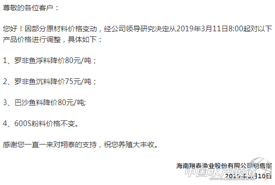 | 中國水產頻道綜合報道, 飼料降價繼續大動作! 2月下旬至3月初的幾輪飼料降價,包括特種水產料、大宗淡水魚料,主要以珠三角為核心地區,而周邊的廣西、海南只是象征性地上漲。(蝦料、海水魚下調以沿海地區為主)。 然而這幾天來,廣西、海南飼料下降出現了大動作,即是說淡水魚料降價的重心逐漸轉移到廣西、海南地區。通威、百洋、翔泰、雙胞胎、歌頌、添祥、向星和基裕等多個廠家都紛紛下調價格,包括黃顙魚、加州鱸、生魚、叉尾在內的特種料,也有普通沉水和浮水魚類,包括草魚、羅非魚等。 其中,南寧通威和賓陽通威高調宣布廣西淡水料市場降價,聲勢甚是浩大。 據通威方面表示,南寧通威和賓陽通威在廣西淡水料市場再掀降價潮,轟動當地養殖圈。這對處于虧損邊緣的廣大養殖戶來說,確實是大快人心的好消息。 “一反常態”并不是今天的突發奇想,其實從去年10月以來,南寧通威、賓陽通威水產在八桂大地的頻繁動作就多次引發業內人士關注。先是在冬季水產淡季強勢推出一系列產品力變革創新:隨著南寧通威、賓陽通威水產并入通威蝦特料片區,新任領導班子提出“用蝦特料思維運營淡水魚料,用特種料工藝鑄造精品魚料”的新理念,主張在廣西淡水市場復制蝦肝強的輝煌。隨之而來的一系列讓利活動更是讓同行大呼看不懂:產品質量在升級,促銷讓利卻在加強,與行業去同步化的節奏愈演愈烈! |
