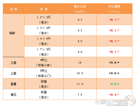 中國水產頻道原創報道,海水特種魚:海鱸級魚價格穩定,后市看穩 海水特種魚:中大規格海鱸價格微漲,供求穩定 鱸魚 本周海鱸中大魚打冰及水車價格均輕微上漲,目前存塘及需求穩定,在禁漁期來臨前預計相對價格波動不大。 立魚 珠海斗門:本周魚價相對穩定,波動不大,目前出魚量較少。 珠海小林:目前市場抓魚量沒有大量增加,魚中抓魚規格偏大,4.5兩上的立魚走量較大,4.5兩下的立魚不受市場歡迎走量非常小。3月份并不是出魚高峰期,預計4月份開始大量出魚。現在立魚病害少,氣溫合適生長,養殖戶不會集體性拋售,預計近期魚價穩定。 盲曹 統級10.5元/斤;大魚打冰10.5元/斤;市場存塘魚不多,后市趨勢預計較穩定。 黃花 存塘舊魚逐漸減少,夠規格上市的新魚數量不多,價格逐漸上升。 【關鍵字】:海魚 價格行情 水產養殖 |