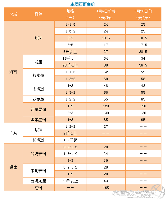 海南:市場價格太低,價格出現回暖預計要等到5月份的休漁期以及節假日的拉動。本周1-2斤的珍珠價格比上周再下降1元/斤,業內人士預計,該規格的珍珠4月份價格可能維持在23.5-25元左右。當前上市量比較少的是2-2.5的珍珠,這個規格的魚價格會比較好。