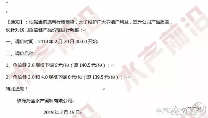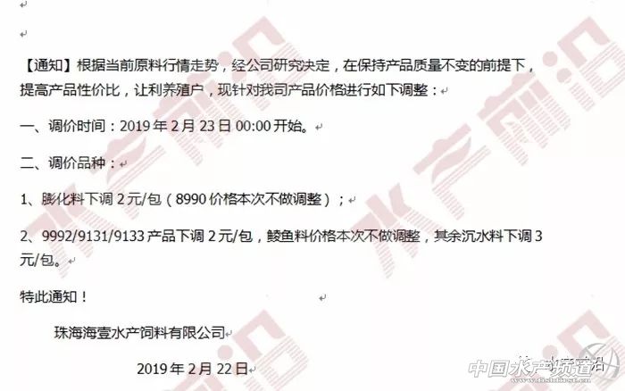 | 中國水產頻道原創報道, 文/ 水產前沿 鄭鵬飛 珠海海壹和珠海海龍可以說分別是海大和通威在華南片區的明星公司,在這輪飼料降價大戰中海壹和海龍的正面對抗也是最為激烈。就在海龍宣布再次降價之后,昨天珠海海壹魚料也是正式宣布今年的第5次飼料降價,草魚膨化料、叉尾膨化料以及多個品種的羅非膨化料全部下調2元/包,其中高樂寶系列膨化料全部下降5元/包。 珠海海壹飼料調價通知 不久前珠海海壹蝦料連續兩次降價幅度都達到300元/噸,果斷的大幅降價讓其他很多公司都望而卻步,不敢輕易跟著降。而在魚料的連續幾輪的降價中,珠海海壹魚料可以說是步步緊逼,一次不落,截止目前累計降價最高已經達到14元/包。為何2019年華南片區的飼料大降價如此激烈?珠海海壹蝦料總經理張奎引用了通威董事長劉漢元的一句話:往前一步一片光明,退后一步萬丈深淵! 附:珠海海壹飼料前4次調價通知 2月19日 2月22日 3月2日 3月11日 |