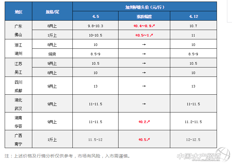 | 中國(guó)水產(chǎn)頻道原創(chuàng)報(bào)道, 養(yǎng)好魚,更要賣好魚! 加州鱸行情周報(bào) 《鱖鱸前沿》與您相約每周五 文/圖 鱖鱸前沿 李曉欣 本周,產(chǎn)區(qū)加州鱸塘頭價(jià)穩(wěn)中有升。廣東佛山加州鱸塘頭價(jià)企穩(wěn)了20天后,在本周迎來“3天2連漲”,漲幅達(dá)1元/斤。此外,受廣東魚價(jià)上漲影響,湖南華容魚價(jià)上漲了0.2元/斤,廣西南寧上漲了0.5元/斤,其他產(chǎn)區(qū)價(jià)格以企穩(wěn)為主。 此次廣東魚價(jià)上漲,一方面是近來佛山大部分加州鱸魚已經(jīng)產(chǎn)卵,體重下降嚴(yán)重,很多養(yǎng)戶認(rèn)為目前賣魚并不劃算,甚至?xí)澅荆鲷~積極性下降;另一方面,受清明假期銷量增多影響,市場(chǎng)上大規(guī)格魚緊缺,很多魚車收不夠魚,收購(gòu)商為刺激養(yǎng)戶出魚來滿足市場(chǎng)訂單而上調(diào)了魚價(jià)。 成魚漲勢(shì)喜人,魚苗方面也不甘落后。目前廣東加州鱸水花生產(chǎn)已經(jīng)接近尾聲,加上前段時(shí)間連續(xù)高溫產(chǎn)量很低,供不應(yīng)求,水花價(jià)格上漲到60-70元/萬尾左右。另外,受天氣、病害等各方面影響,佛山今年育苗成活率不容樂觀,業(yè)內(nèi)人士估計(jì)不足1成,這也助漲了苗價(jià),目前9朝苗的價(jià)格在0.6-0.7元/尾左右,預(yù)計(jì)接下來苗價(jià)還有上漲空間。 廣東佛山 佛山8兩上加州鱸今天報(bào)價(jià)10.7元/斤左右,相比上周價(jià)格上漲了0.4-0.9元/斤;9兩上報(bào)價(jià)11元/斤,上漲了1元/斤,實(shí)際成交價(jià)看魚頭大小及8兩上規(guī)格比例而定。近期市場(chǎng)對(duì)大規(guī)格魚需求量較大,目前鱸魚正值產(chǎn)卵季,養(yǎng)戶出魚意愿不大,魚價(jià)有所上漲。 浙江湖州 本周湖州8兩上鱸魚維持在10元/斤,統(tǒng)貨維持在8.5-9元/斤。目前當(dāng)?shù)卮嫣留~已經(jīng)不多,由于正值產(chǎn)卵季,當(dāng)?shù)伧|魚很多大肚子,條形不好,價(jià)格上漲乏力。 江蘇吳江 吳江鱸魚價(jià)格一周企穩(wěn),8兩上報(bào)價(jià)10元/斤,9兩上10.5元/斤。目前當(dāng)?shù)卮蟛糠逐B(yǎng)戶已經(jīng)投放水花,部分養(yǎng)戶為了并塘準(zhǔn)備育苗而出魚,但總體出魚量不大。 四川成都 本周成都9兩上鱸魚塘頭價(jià)維持在13元/斤。成都大部分養(yǎng)殖戶在3月底前后已經(jīng)放苗,目前當(dāng)?shù)剡_(dá)上市規(guī)格的存塘魚有所減少,部分還有存塘魚的養(yǎng)殖戶想趕在魚產(chǎn)卵前出。 湖北武漢 本周武漢9兩上加州鱸維持在11-11.5元/斤,目前當(dāng)?shù)剡_(dá)上市規(guī)格的存塘魚已經(jīng)不多,流通商多到江浙地區(qū)收魚,魚價(jià)上漲乏力。 湖南華容 本周華容魚價(jià)上漲了0.2元/斤,今天9兩上報(bào)價(jià)11.2-11.5元/斤,主要是受廣東魚價(jià)上漲影響,近期當(dāng)?shù)仞B(yǎng)戶陸續(xù)清塘放苗。 廣西南寧 受廣東魚價(jià)上漲影響,本周南寧魚價(jià)上漲了0.5元/斤,今天1斤上報(bào)價(jià)12-12.5元/斤。目前南寧本地存塘魚達(dá)上市規(guī)格的較少,流通商多到廣東地區(qū)拉魚。 產(chǎn)區(qū)加州鱸塘頭價(jià)一周對(duì)比 |