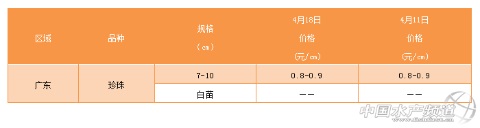 | 中國水產頻道原創報道, 海南、福建、廣東、北京石斑魚報價 文/ 水產前沿 吳佳輝 石斑商品魚 海南:小規格珍珠價格皆出現下滑,1-1.6斤的珍珠下滑1元/斤,1.6-2斤的下滑3元左右,這也導致北方石斑魚價格有所下滑,但幅度不大。價格下滑,總的原因還是消費量少,而出塘量大,再加上天氣差的原因,價格遲遲不見上漲。 廣東:1.2-2斤的珍珠價格對比上周又下滑1元/斤,價格遲遲為見起色。 福建:價格基本不變。 北方地區:由于海南石斑魚價格下滑,本周北方石斑魚對比上周也略有下滑,但幅度不大,只有0.5元/斤的幅度。 石斑魚苗 廣東:春節前后,大多數養殖戶已投放石斑魚苗,目前只有小部分養殖戶陸陸續續投苗。 特別感謝:海南晨海水產有限公司、海南大順發水產有限公司、萊州明波水產有限公司、廣東上上生物科技有限公司、廣東大順發水產有限公司為本文提供價格! |