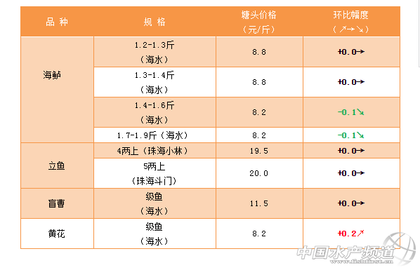 | 中國水產(chǎn)頻道原創(chuàng)報(bào)道, 文/ 珠海海龍 水產(chǎn)前沿 吳佳輝 海水特種魚:海鱸價(jià)格微跌,后市預(yù)計(jì)上漲 鱸魚 鱸魚中大魚價(jià)格總體輕微下跌,本周經(jīng)歷了下行再回升,5月天氣穩(wěn)定加之禁漁期來臨,預(yù)計(jì)后市價(jià)格會(huì)上漲。 立魚 珠海小林:市場(chǎng)出魚量增加,以大規(guī)格立魚為主(4.6兩上),并且近期天氣適合立魚生長(zhǎng),且病害少,客戶養(yǎng)殖積極性較高,所以立魚價(jià)格穩(wěn)定。 珠海斗門:本周魚價(jià)穩(wěn)定。 盲曹 統(tǒng)級(jí)10.5元/斤;大魚打冰10.5元/斤。 黃花 級(jí)魚存塘數(shù)量不多,價(jià)格逐步上升。大魚需求少,價(jià)格穩(wěn)定,今年黃花放苗同比減少,預(yù)計(jì)禁漁期新魚數(shù)量不多,后續(xù)看漲。 其它品種 |
