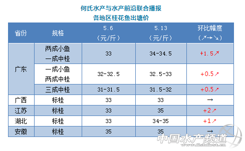 | 中國(guó)水產(chǎn)頻道原創(chuàng)報(bào)道, 文/圖 何氏水產(chǎn)、水產(chǎn)前沿 李靜 桂花魚(yú) 1、經(jīng)過(guò)了幾天的爛市,今天廣東桂魚(yú)價(jià)格又開(kāi)始止跌回升,最高上漲1.5元/斤。本輪價(jià)格上漲主要由于市場(chǎng)爛市,市場(chǎng)成交價(jià)低,銷(xiāo)量也不多,大部分收購(gòu)商因開(kāi)魚(yú)價(jià)格太高虧本不敢開(kāi)魚(yú),但是為了滿(mǎn)足市場(chǎng)訂單又不得不把魚(yú)拉回來(lái)。現(xiàn)在餌料魚(yú)價(jià)格很低,偏小規(guī)格的養(yǎng)戶(hù)想再養(yǎng)大點(diǎn)再賣(mài),偏大規(guī)格的養(yǎng)戶(hù)由于價(jià)格達(dá)不到心里預(yù)期而選擇暫不出來(lái),總體賣(mài)魚(yú)積極性不高。現(xiàn)在最好規(guī)格的格的魚(yú)(6-7成標(biāo)桂,1成中桂)價(jià)格最高訂到34.5元/斤左右,偏大點(diǎn)的魚(yú)價(jià)格在33元/斤左右,中桂越多價(jià)格越低。主要看實(shí)際規(guī)格和出魚(yú)時(shí)間來(lái)定價(jià)。預(yù)計(jì)近期桂魚(yú)價(jià)格或?qū)⒎(wěn)中有升,尤其是偏小規(guī)格,銷(xiāo)量平穩(wěn)。 2、除廣西、安徽外其它地區(qū)的標(biāo)桂價(jià)格都有所上漲,最高上漲2元/斤。銷(xiāo)量本周與上周基本持平。 |