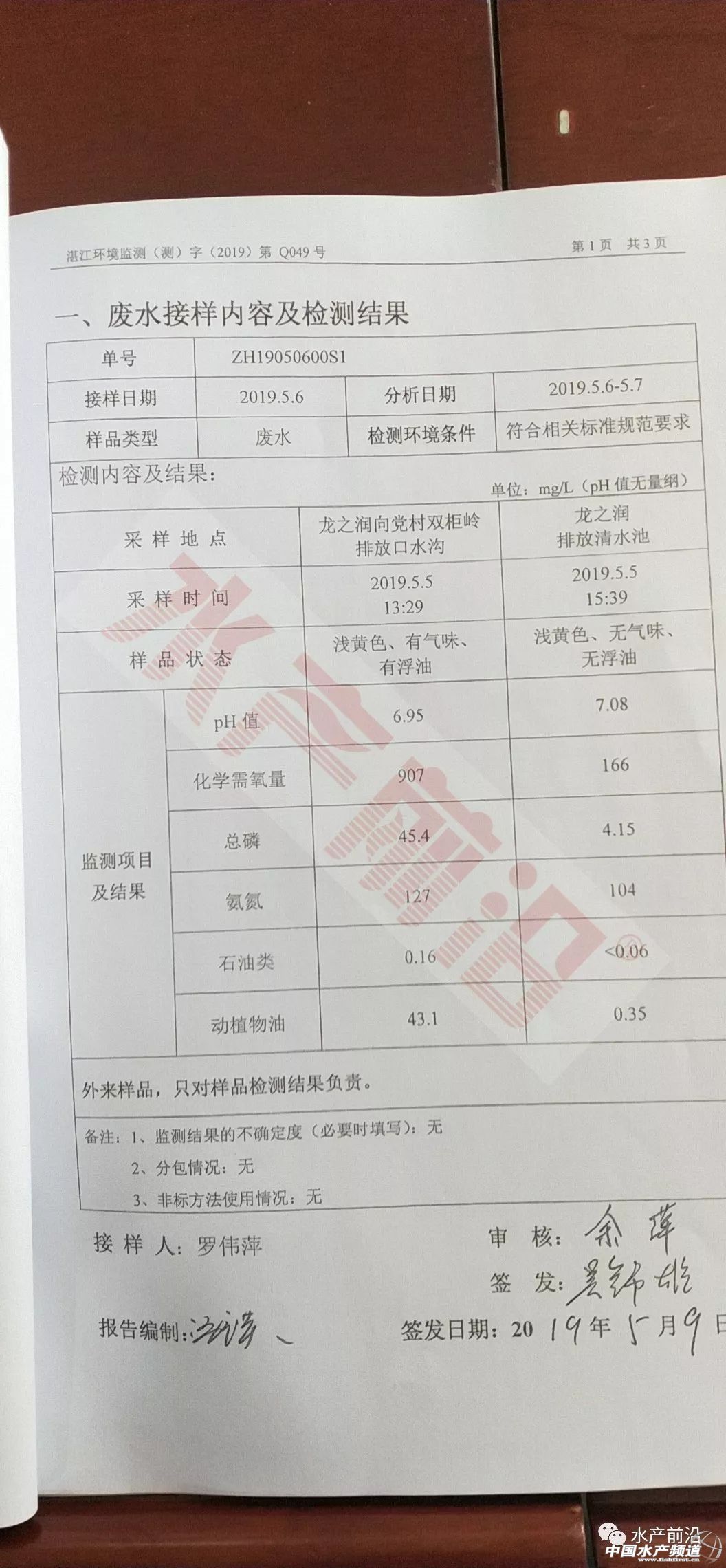| 中國水產頻道原創報道, 相關檢測報告已出:廢水濃度超排放標準,但死魚原因未有定論。 文/圖 中國水產頻道 此前,中國水產頻道報道了雷州烏石港網箱養殖魚在短短1-2天內數幾十萬斤價值千萬元的石斑魚全部翻肚死亡,部分魚排已全軍覆沒,養殖戶血本無歸。眾人懷疑是當地一水產加工廠排污毒污水導致大批量魚慘死,事件一經報道,立刻引起了水產業界人士高度關注和熱議。 事件回顧: 5月5日約凌晨時分,部分人養殖的雜魚如黃鰭鯛等就出現大量的死亡,6日凌晨約1點時刻,珍珠龍膽相繼大規模死亡。養殖戶立刻采取了應急措施,全開增氧機、投放增氧劑,但仍然無濟于事,最終死魚量超過20萬斤,損失預計達上千萬元。 烏石港周邊有近200名養殖戶,其主要養殖品種多為珍珠龍膽。自烏石港網箱魚大量慘死后,養殖戶無心處理網箱中的死魚,漁船上、魚排上、籃子里、碼頭上堆滿了魚的尸體,大海上隨處可見飄浮的死魚,受災的養殖戶愁云滿面,對日后的生計一片茫然,甚者還會因此欠下巨債。 烏石港死魚事件發生后,為盡快查明魚類死亡原因并有效指導養殖戶自救,當地政府及環保部門積極邀請水產專家到烏石鎮調研,并在各養殖漁排調查取樣,隨后相關樣本送至湛江市相關機構做檢測。 如今,中國水產頻道獲悉事件最新動態,相關檢測結果已經出來,內容如下: 雷州市環境保護局 關于近期烏石鎮烏石港魚類非正常死亡 事件的調查報告 雷州市人民政府: 2019年5月5日上午,多名群眾到烏石鎮政府反映烏石港養殖區于當日凌展出現大量死魚,要求鎮政府處理,烏石鎮政府領導接訪后向相關部門反映了該情況,我局緊息派員對陸地上游情況進行排查,5月7日,我局監測人員再次對上下游進行了采樣監測。市政府對此事高度重視,5月8日,副市長曹康武組織了調查處置小組前往事發現場布置工作。經我局主要領導組成的調查組多次現場調查及走訪了解,現將調查情況報告如下: 烏石港作為漁港又同時接納了多條地表徑流及烏石鎮的生活污水,包括從上游覃斗鎮、農田沖刷的地表水、蝦塘推水以及上游位于烏石村附近的濕地塘水。2019年5月4日,烏石鎮下了一場久違的大雨,這是自去年中秋以來當地的第一場大雨,當天20時左右,積蓄多日的濕地水塘積水伴著雨水、上游沖刷地表水等水流排入海中。濕地水塘面積將近200畝,始于雙柜嶺集水塘,水路延伸約600米到達上游水閘,經過約800米蝦塘納水溝到達下游水閘,后通過長約1.6公里的海溝最終經情人橋入海。濕地水塘組成因素較為復雜,濕地水塘存在時間久,上游有大片荒地集水,底泥渾濁。 同時,我局對位于事發養殖區上游約3公里的雷州市龍之潤水產品有限公司進行了檢查,該公司主要經營魚皮及魚鱗加工,加工過程中產生廢水。執法人員在調查過程中發現,該公司將廢水從沉淀池引至距其廠區約300米的雙柜嶺上排放,監洲人員雙柜嶺上的管道口殘留的廢水進行了采樣監測,監測結果顯示廢水濃度超過了排放標準,市環保局已于5月6日依法立案并于5月8日向該公司發出《責令改正違法決定書》,責令該公司改正上述違法行為并立即停產整改,后續該案件將依法移送公安機關辦理。 由手事件情況較為復雜,魚死亡的具體原因我局無法判定,為此我局建議市農業農村部門和烏石鎮政府牽頭對此事進行全面調查,我局將密切配合農業農村部門和烏石鎮政府做好后續相關工作。 特此報告 附件: 1,監洲報告(湛江環境監湖(測)字(2019)第0049號) 2,監洲報告(湛江環境監湖(測)字(2019)第0050號) 雷州市環境保護局 2019年5月10日 網 友 意 見 相關檢測報告發出后,部分網友也對此事發表了自己的看法: 因河流上游下泄污水導致下游魚死亡事故的原因查找起來比較困難。因為水是流動的,幾天前的河水,跟現在相比水質可能完全不一樣,即污染團過去了。但是,如果通過監測發現下泄污水中如果有特征污染物的話,比如有重金屬鉻,還是可以開展溯源分析的,鎖定污染源是沿河的某家廠。 再者,無毒有害的生活污水大量進入河流,也會造成河流中大面積魚死亡事故。因為分解生活污水中的有機物,會消耗水中大量的氧,導致河流導致缺氧或無氧,直接導致魚蟹缺氧死亡。建議依法開展公益訴訟。據分析,此次魚死亡事故取證將非常困難,如果不能確認污染主體,要通過司法索賠存在很大難度。建議全國范圍內有條件的單位可以伸出援手開展公益訴訟,幫助受災的魚蟹養殖戶進行法律訴訟,助魚蟹養殖戶一臂之力。 相關檢測報告 廣東省水產經濟動物病原生物學及流行病學重點實驗室石斑魚檢測報告 |