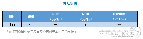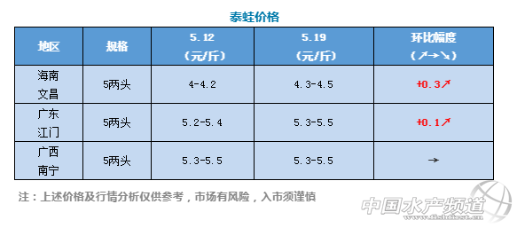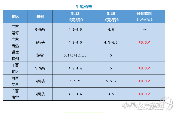 中國水產頻道原創報道, 目前牛蛙行情主要還是受禁養拆遷的影響 文/ 水產前沿 陳曉慶 一周行情簡析 牛蛙 廣東:5月19日廣東澄海地區牛蛙報價4.6元/斤,價格波動幅度不大,據知情人士透露,受氣候條件影響,明天澄海牛蛙黑市價格將降到4.2元/斤。廣東清遠5月19日7兩頭規格的牛蛙報價4.5-4.6元/斤,相比上周上漲了0.3元/斤,也有養殖戶前天一萬多斤牛蛙賣到了4.7元/斤。 福建:福州5月19日牛蛙現金價4.3元/斤、欠賬5元/斤,相比上周略微下降了0.1元/斤。日前,福州羅源縣白塔鄉發布關于《白塔鄉牛蛙養殖污染專項整治工作的再通知》,要求白塔鄉轄區范圍內牛蛙養殖場一律限于2019年5月30日前予以退養或者關閉拆除。據業內人士介紹,目前當地較多的還是沒有投苗的養殖場,對于小蛙會直接拿去賣給其他地方,也有一部分養殖戶會報著僥幸心理,只有部分大蛙的養殖場會著急賣,但總體大蛙的量并不多,所以對于大蛙市場價格影響不大。 江西:目前江西禁養地區的養殖場還未拆完,但價格卻出現了喜人的上漲。5月19日江西地區5-9兩規格的牛蛙報價5元/斤,相比上周上漲了0.8元/斤。 廣西:南寧地區7兩頭規格的牛蛙5月19日報價4.5元/斤,相比上周上漲了0.3元/斤。 海南:文昌地區的牛蛙5月19日報價5-5.5元/斤,相比上周上漲了0.3元/斤。相對于內地的禁養風波,海南顯得頗為平靜。目前海南成蛙的存塘量并不多,以蝌蚪到2兩的蛙為主。 牛蛙價格 青蛙(黑斑蛙) 目前青蛙商品蛙的存量還是比較少,再過10天左右大部分都要進入訓食階段,投苗的養殖戶也較少。 泰國虎紋蛙 目前內地的泰蛙基本上已經賣完了,很多海南的蛙發貨到廣東,當地價格上漲。 【關鍵字】:蛙 價格行情 水產養殖 |
