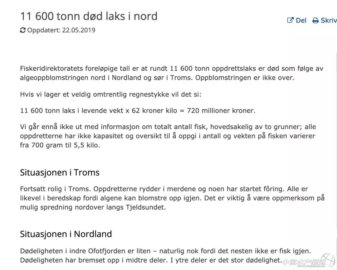| 中國水產頻道原創報道, 挪威漁業局通報約11600噸三文魚受災,受災三文魚規格從700g至5.5Kg不等。水華爆發影響下半年挪威三文魚供應量,或影響全球價格上漲。 譯/ 海鮮指南(seafood-guide)沈基文 最新消息:約11600噸三文魚受災,受災三文魚規格從700g至5.5Kg不等 當地時間5月22日(周三),挪威漁業局官方通報稱,挪威諾德蘭郡(Nordland)北部和特羅姆斯郡(Troms)以南因藻類繁殖的赤潮現象已造成約11600噸養殖三文魚受災死亡,受災三文魚規格從700g至5.5Kg不等。 如按照每公斤6.2歐元來計算,此次受災三文魚已導致損失約7200萬歐元(約7.2億挪威克朗)。 截止到5月22日,諾德蘭的三文魚產量損失約4800噸,特羅姆斯損失6800噸。諾德蘭的BallangenSj?farm、Ellingsen Seafood和Mortenlaks公司受到影響;特羅姆斯的S?rrollnesfisk、Northern Lights Salmon、Kleiva Fiskefarm、Gratanglaks、Nordlaks和Salaks公司受到影響。 據了解,Ofotfjord峽灣內的三文魚死亡率已終止,峽灣中部Mortality的影響正在放緩。“Norwegian Gannet”號大型捕撈加工船正在協助捕撈未受影響的三文魚以轉移到其他安全區域。 受災三文魚 當地時間5月16日,挪威漁業局收到來自挪威特羅姆斯(Troms)的Astafjorden地區和諾爾蘭島(Nordland)的Ofotfjorden地區出現因赤潮導致的三文魚死亡情況。藻類的大量繁殖正在影響諾爾蘭島和特羅姆斯南部之間的海域,該海岸線長約450公里。外媒稱,這是特羅姆斯地區自1991年以來爆發最嚴重的水華。 事發之時,挪威漁業局已與赤潮所到地區養殖場進行調研以找出所涉及的藻類類型。 水華爆發影響下半年挪威三文魚供應量,或影響全球價格上漲 照片來自挪威海洋研究所 5月21日,來自挪威海洋研究所的消息顯示:“在來自兩個縣的水樣中,已經在Chrysochromulina屬中檢測到藻類。這是挪威水域中常見的藻類,但在對藻類特別有益的條件下,它可以大量擴散并且對魚類是致命的。” 目前已經被證實,名為Chrysochromulina leadbeaterii的藻類已經造成了挪威北部的三文魚死亡。據悉,這并不是Chrysochromulina leadbeaterii在挪威北部大規模爆發,此前的1991年5月、6月以及2008年5月都出現過。 赤潮,也稱水華、潮華(Algae bloom),是一種藻類,微藻對海洋生物基本無害,但一旦大量繁殖,極有可能導致魚類和其他海洋生物死亡。藻類分泌溶血化合物與魚鰓接觸導致魚體內氧氣不足并最終死亡。 赤潮的爆發令挪威部分三文魚產量減少,預計下半年供應量將減少,2019年下半年價格或上漲。來自Nordea Markets的分析師Kolbj?rn說:“我們估計,到目前為止,未來捕撈量將至少減少3萬噸,將明顯對挪威供應量產生影響。” |
