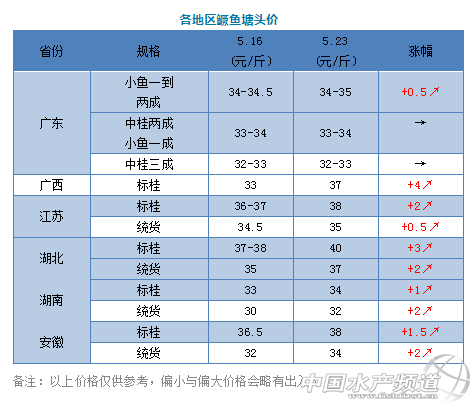 | 中國水產頻道原創(chuàng)報道, 鱖魚價格有望節(jié)節(jié)攀升,你還有魚嗎? 文/圖 鱖鱸前沿 李靜 時至5月下旬,全國鱖魚價格迎來了2019年第一輪暴漲小高峰。 最近兩周以來,多個省份的鱖魚價格持續(xù)暴漲,其中湖北最高漲了6元/斤,目前標桂已高達40元/斤;廣西漲了4元/斤,標桂37元/斤;江蘇、安徽標桂漲了3元/斤,標桂38元/斤。不得不說,最近的鱖魚價格漲勢驚人,而未來一到兩個月隨著存塘量進一步減少,預計全國鱖魚價格可能還有一定上漲空間。 與其他省份鱖魚存量大幅減少價格快速暴漲不同,廣東地區(qū)的鱖魚價格漲幅較小,價格暫時趨勢穩(wěn)定。但據(jù)廣東流通商反映,今天開始廣東鱖魚市場行情好轉,養(yǎng)殖戶賣魚積極性下降,近期價格或有上漲機會。 餌料魚 本周餌料魚舊魚價格變化不大,新魚200-500口大約5.5元/斤,10朝上5元/斤,9-10朝5.5-6元/斤。 鱖魚苗 目前鱖魚小苗約0.1-0.11元/公分,大苗0.12-0.13元/公分,近期外省放苗的養(yǎng)殖戶較多,廣東本地放苗較少。 |