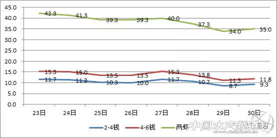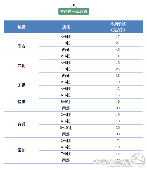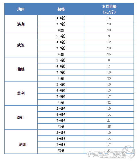 | 中國水產頻道報道, 小龍蝦上市正當時 全國小龍蝦行情解析 水產前沿與您相約每周四 文/ 水產前沿 鄭鵬飛 據了解,這兩天各地小龍蝦行情出現大漲,多個地區漲幅達到3元/斤。其中,湖北洪湖地區1兩的小龍蝦從35元/斤上漲到38元/斤,上漲3元/斤;湖南岳陽地區7-9錢的從16元/斤漲到18元/斤,上漲2元/斤;四川成都市場7-9錢的規格從16漲到了19元/斤,上漲3元/斤;北京市場上1兩的小龍蝦從33元/斤漲到了36元/斤,上漲3元/斤。廣州、上海、深圳等主要城市小龍蝦市場批發價均出現上漲。有養殖戶表示,這波小龍蝦價格至少要上漲3-5元/斤。 不過也有流通商反映,每年4-5月的這段時間小龍蝦價格都會有一次大的波動。尤其最近這段時間小龍蝦在猛跌了10元左右,這兩天價格又出現猛漲,價格很難預測。 全國小龍蝦最新行情 全國主要一線城市市場批發均價 全國主要一線城市市場批發價 主產區—湖北省 湖北小龍蝦主要產區平均批發價 |