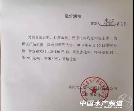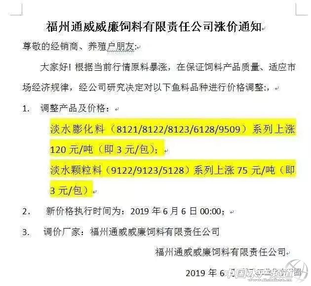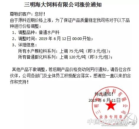 | 中國水產頻道獨家報道, 6月11日,海大水產料正式漲價! 文/ 水產前沿 整理 6月12日,水產料漲價勢頭仍在持續,范圍已由廣東蔓延至福建市場。據了解,目前三明海大、福州通威威廉、福建粵海、福州恒興、福建澳華等企業都已上調普水料的價格,漲幅一致,為顆粒料上漲75元/噸、膨化料上漲120元/噸。廈門通威還沒調價,但近日內也會動。 三明海大飼料有限公司漲價通知 福建通威威廉飼料有限責任公司漲價通知 在此之前,陸續已有多個料企上調了水產飼料價格,包括通威、大北農、新希望等。其中上漲最大幅度的為生魚料,最高上調450元/噸。 通威股份有限公司茂名分公司調價通知 武漢大北農水產科技有限公司飼料價格調整通知 豐順新希望生物有限公司調價通知 尊敬的客戶: 因原料價格大幅度上漲,為了保證產品質量,經公司研究決定,于2019年6月10日7點起對公司水產料產品價格進行上調: 1、魚苗寶上調150元/噸。魚大大、魚壯壯、865羅非料上調120元/噸; 2、魚旺旺、魚種粉料、上調75元/噸; 特此通知! 豐順新希望生物有限公司 2019年6月9日 揭陽通威飼料有限公司調價通知 尊敬的各位經銷商、養殖戶朋友: 感謝大家一直以來對公司產品的支持,由于魚粉、豆粕等原料價格大幅度上漲,為保證飼料產品質量,經公司研究決定,從2019年6月5日7點起對我司產品價格進行漲價調整,各品種價格調整幅度具體如下: 浮水料上漲120元/噸; 沉水料上漲75元/噸; 其它產品價格暫不作調整; 揭陽通威飼料有限公司 2019年6月4日 揭陽國雄飼料有限公司漲價通知 尊敬的客戶: 因原料價格大幅度上漲,為了保證產品質量,經公司研究決定,于2019年6月6日7點起對公司水產料產品價格進行上調: 1、生魚料3#上調450元/噸,生魚料其他品種上調150元/噸; 2、魚苗寶上調150元/噸、其余膨化料上調120元/噸; 3、草魚顆粒料上調75元/噸; 4、肝腸健及魚蝦混養料價格暫不調整! 特此通知! 揭陽國雄飼料有限公司 2019年6月5日 |