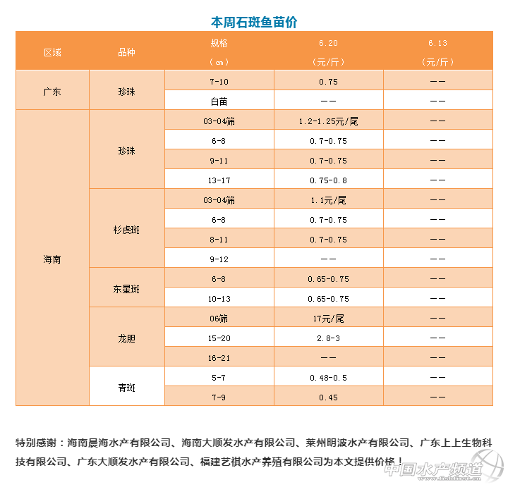 | 中國水產(chǎn)頻道原創(chuàng)報(bào)道, 消費(fèi)量或略有提升,下周小規(guī)格的珍珠價(jià)格會(huì)上漲0.5-1元/斤 文/ 水產(chǎn)前沿 吳佳輝 石斑商品魚 海南:當(dāng)前是淡季,漲價(jià)幅度不會(huì)太明顯,也不會(huì)出現(xiàn)明顯下滑,價(jià)格還是相對(duì)比較穩(wěn)定。不過,當(dāng)前為畢業(yè)季,小規(guī)格的珍珠可能消費(fèi)量略有提升,業(yè)內(nèi)人士預(yù)計(jì)下周小規(guī)格的珍珠價(jià)格會(huì)上漲0.5-1元/斤。 |
