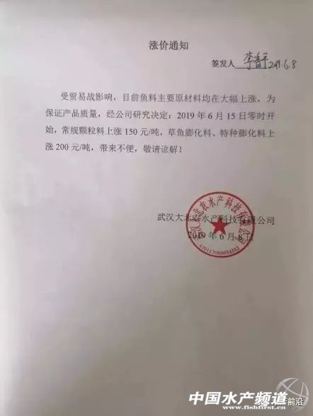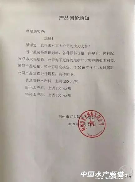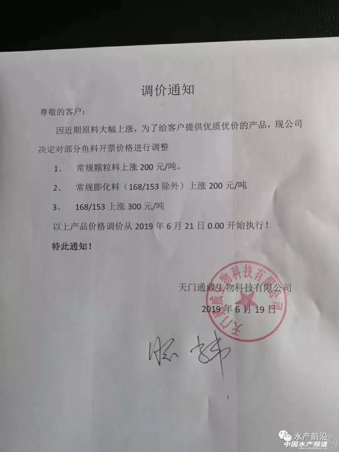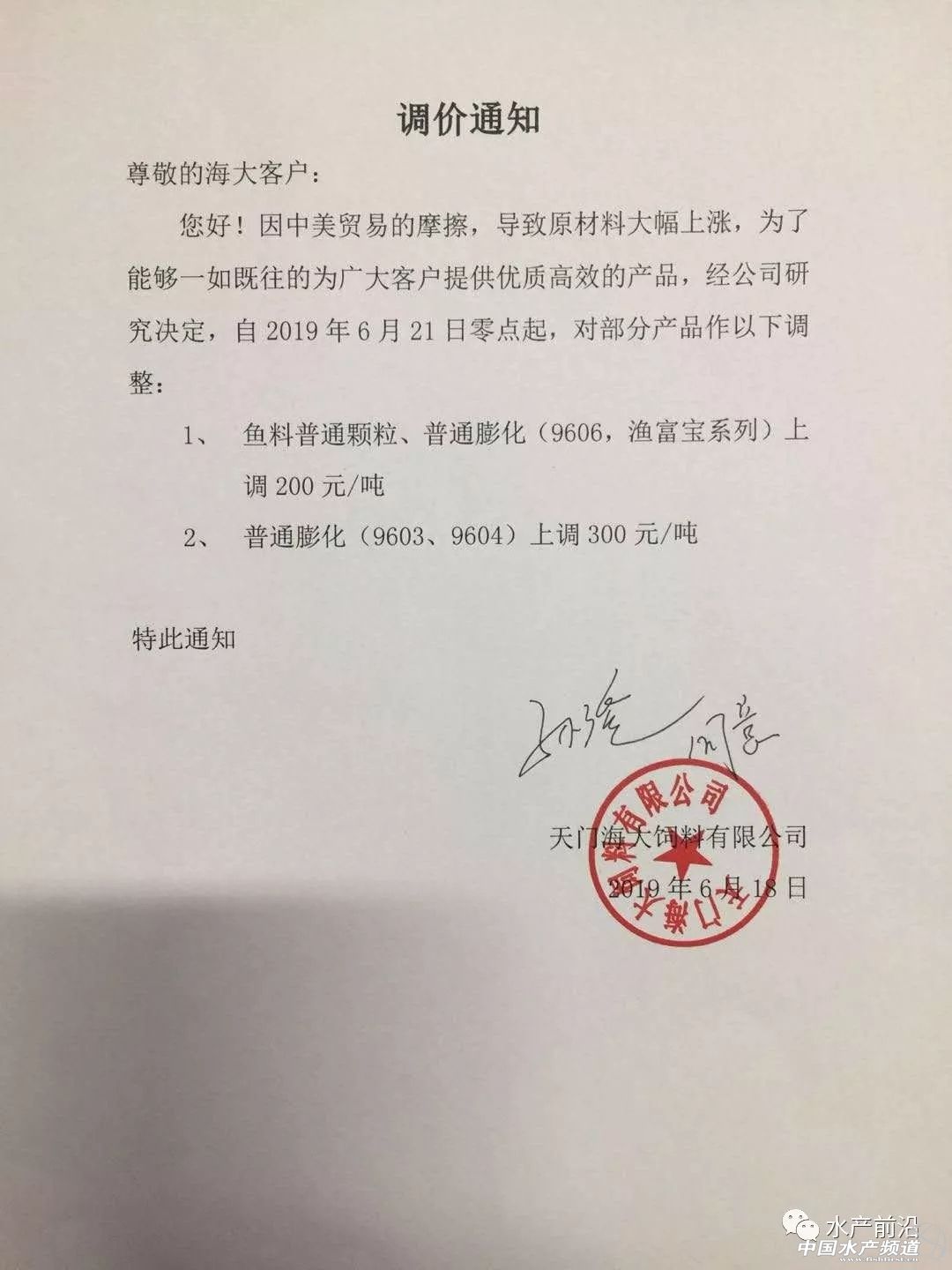 | 中國水產頻道獨家報道, 行情跌宕起伏,豆粕2天內暴跌100元/噸,飼料還漲價嗎? 文/ 中國水產頻道 整理 近來,湖北市場甚是令人關注,原因是這里的水產飼料一波波地漲價! 湖北飼料全線漲價 6月17日,荊州市飼料工業協會發布原料行情分析探討會通過水產飼料漲價決議。決議稱,因中美貿易摩擦影響,飼料原料價格一路飆升,飼料配方成本大幅增長,企業壓力山大。荊州市飼料工業協會于6月17日召開探討會,磋商、討論、分析市場行情走勢,提出應對方案,解決當前困難。參會飼料企業負責人一致同意6月18日開始執行漲價政策:建議具體調價幅度為:1、普通顆粒水產料漲價150元/噸;2、膨化水產料漲價200元/噸;3、特種水產料漲價300元/噸。 而實際上,在荊州市飼料工業協會發布飼料漲價之前,已有不少企業頂不住壓力,上調了飼料價格。 6月7日武漢正大水產宣布漲價:特種魚(包含青蛙料、鲌魚料、泥鰍料、鱸魚料、黃顙料、X0#)價格上調100元/噸。 6月15日武漢大北農宣布漲價:常規顆粒料上漲150元/噸,草魚膨化料、特種膨化料上漲200元/噸。 緊接著,6月18日起荊州市京大飼料有限公司宣布漲價:上漲幅度為:普通顆粒水產料,上調150元/噸;膨化水產料,上調200元/噸;特種水產料,上調300元/噸。 6月18日洪湖海大宣布飼料漲價。6月19日天門海大、天門通威宣布飼料漲價,兩企業的普通顆粒料和普通膨化料上漲的幅度一致,為200-300元/噸。三個公司調價時間均為6月21日零時執行。 另外,漢川恒興表示或者6月22日漲價,武漢澳華預計6月25日漲價。華中粵海劉總暫時不漲。 談判有望再度啟動,國內豆粕應聲暴跌 據悉,近日中美貿易再度啟動談判,業界預測有望達成協議。昨天、今日豆粕主流報價連續高位大幅暴跌回落,累計疊加較6月17日最高點跌了100元/噸。 豆粕價格下跌,對料企生產壓力可起到緩解作用,或者猛烈的漲價勢頭有望得到遏制。 6月29日飼料原料價格表 6月20日飼料原料價格表 附各大料企漲價通知: 天門海大飼料有限公司調價通知 洪湖海大漲價通知 受中美貿易戰影響,從5月開始大宗原料暴漲。為保證產品質量,經公司研究決定,從2019年6月21日零時開始,公司魚種料、混養成魚料上漲100元/噸,草魚膨化料上漲150元/噸,其他專養料上漲150元/噸。 天門通威生物科技有限公司 荊州市京大飼料有限公司 武漢大北農水產科技有限公司漲價通知 武漢正大漲價通知 因原料價格上調,武漢正大水產從6月7日起特種魚(包含青蛙料、鲌魚料、泥鰍料、鱸魚料、黃顙料、X0#)價格上調100元/噸,敬請相互轉告,不便之處,敬請諒解! 荊州市飼料工業協會通過水產飼料漲價決議 |