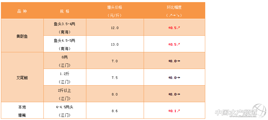 文/ 珠海海龍、水產(chǎn)前沿 吳佳輝 中國水產(chǎn)頻道原創(chuàng)報道,南海區(qū)域黃顙魚:現(xiàn)在5.5兩頭左右發(fā)價13.5塊,4.5兩頭左右發(fā)價12.5塊。價格相對于之前是有5毛錢左右的升浮,不過魚中之間的塘頭收魚價也是會有所差異。 |