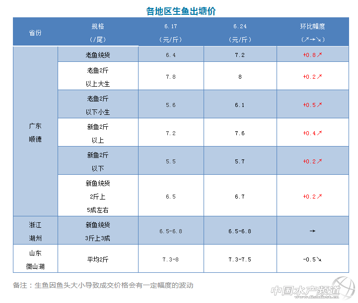 | 中國(guó)水產(chǎn)頻道原創(chuàng)報(bào)道, 文/圖 何氏水產(chǎn)、水產(chǎn)前沿 李靜 生魚(yú) 廣東生魚(yú)經(jīng)過(guò)上周的微調(diào)后,本周價(jià)格又一次微漲,新魚(yú)2斤上的價(jià)格上漲了0.4元/斤,達(dá)到7.6元/斤左右,2斤以下的價(jià)格也上漲了0.2元/斤,達(dá)到5.7元/斤左右,統(tǒng)貨的價(jià)格也上漲了0.2元/斤,6.7元/斤,實(shí)際成交價(jià)格還是要看魚(yú)的規(guī)格和魚(yú)頭大小來(lái)定價(jià)。老魚(yú)大生的存塘魚(yú)已經(jīng)基本沒(méi)有,本周統(tǒng)貨價(jià)格上漲了0.8元/斤,2斤以上大生也上漲了0.2元/斤,2斤以下小生價(jià)格也上漲了0.5元/斤,價(jià)格分別是7.2元/斤、8元/斤、6.1元/斤。 1、浙江湖州本周價(jià)格與上周價(jià)格相比,新魚(yú)統(tǒng)貨,3斤上3-5成價(jià)格與上周一樣,價(jià)格在6.5-6.8元/斤,現(xiàn)在銷量也上周差不多。 2、山東微山湖價(jià)格經(jīng)過(guò)上周價(jià)格的上漲,本周價(jià)格下跌了0.5元/斤,只有7.3-7.5元/斤,銷量相對(duì)少了一些。 |