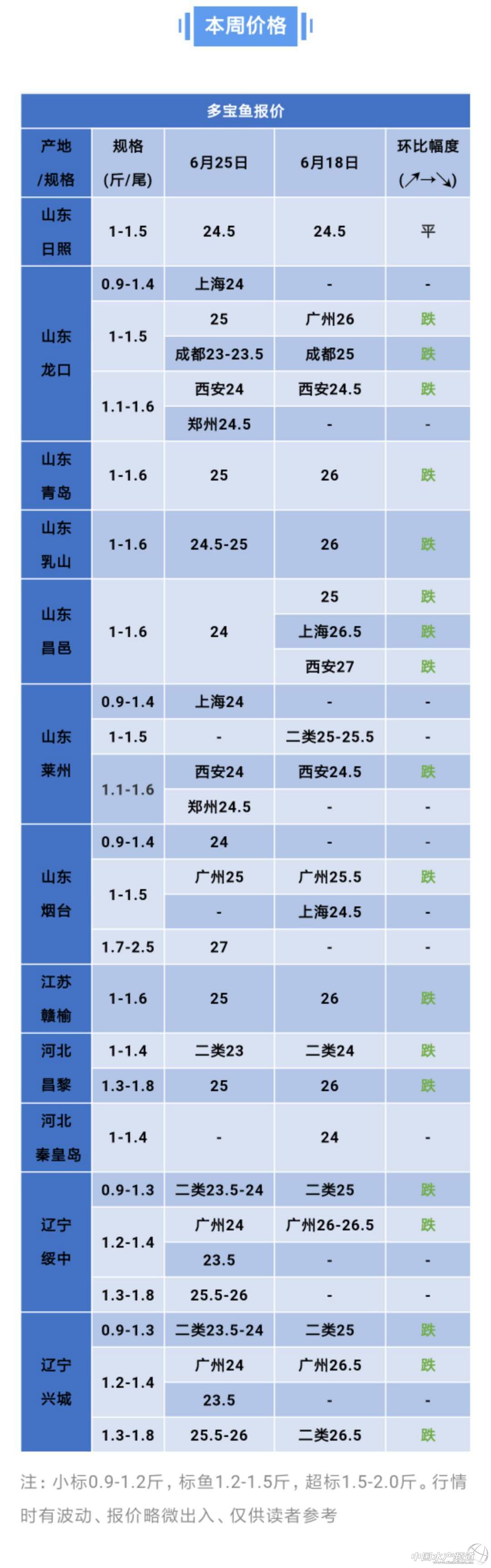 | 中國水產(chǎn)頻道原創(chuàng)報道, 環(huán)渤海排污口整治開始,多寶魚養(yǎng)殖產(chǎn)量、價格行情會受影響嗎? 文 | 表 工業(yè)化水產(chǎn)圈 植銀素 本周行情 據(jù)生態(tài)環(huán)境部于6月24日消息,生態(tài)環(huán)境部在今年1月開展唐山黑沿子鎮(zhèn)試驗性排查的基礎(chǔ)上,于 6月24日啟動河北唐山、天津(濱海新區(qū))、遼寧大連、山東煙臺等4城市入海排污口現(xiàn)場排查工作。 遼寧、山東均為多寶魚養(yǎng)殖集中區(qū)域,消息發(fā)布之后難免引起了部分養(yǎng)殖戶恐慌,今天有養(yǎng)殖戶在某多寶魚行情交流群里討論排查工作相關(guān)進展。 但經(jīng)筆者了解,目前關(guān)于入海排污口排查工作對多寶魚養(yǎng)殖是否產(chǎn)生影響還未有確切消息。業(yè)內(nèi)相關(guān)人士表示目前還未收到官方發(fā)布的多寶魚養(yǎng)殖相關(guān)消息,會隨時留意,以防生產(chǎn)發(fā)生變化,建議養(yǎng)殖戶應(yīng)做好手頭上的工作,注重環(huán)境保護,綠色養(yǎng)殖。 本周多寶魚行情仍在下滑,上周有民間商會發(fā)動養(yǎng)殖戶聯(lián)合保價,但效果似乎并不理想。本周山東、遼寧等主產(chǎn)區(qū)多寶魚價格下滑1-2元左右。山東流通商表示目前網(wǎng)箱魚開始清底,如果有品質(zhì)不佳的魚還是會影響價格。而且養(yǎng)殖戶“賣跌不賣漲”難以改變,后續(xù)多寶魚行情可能還會走低。 希望所有的多寶魚養(yǎng)殖戶加強溝通,讓信息更通暢一些,每個人都能賣出高價,好價! |