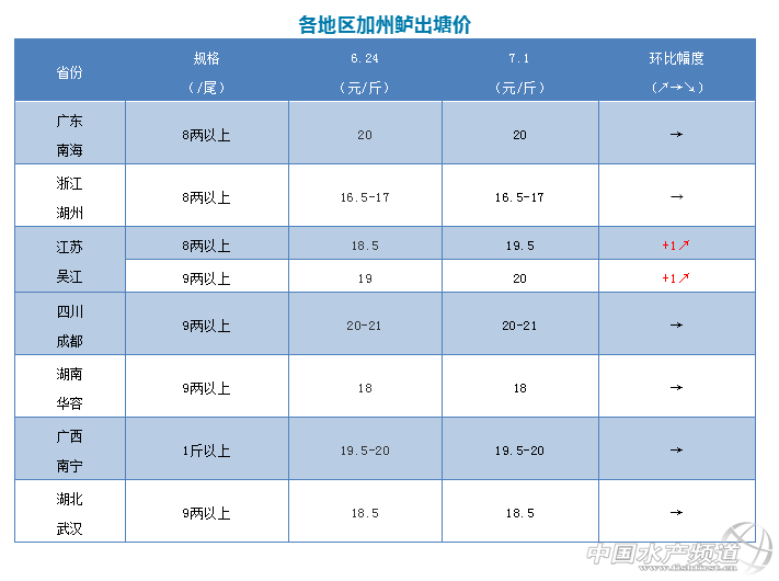 | 中國水產頻道原創報道, 文/圖 何氏水產、水產前沿 李靜 加州鱸 本周全國加州鱸價格除浙江蘇吳江地區比上周上漲了1元/斤外,其他產區的價格與上周保持穩定。 1、廣東鱸魚8兩以上開塘價跟上周一樣,還是20元/斤,9兩和1斤以上的開塘價也是一樣,實際成交價格還是要看魚的質量和8兩以上的比例來定價,現在大部分還是在清塘出魚或者裝6兩以上為主,沙頭產區則出8兩以上為主。現在存塘量還是以沙頭產區為主,外區的存塘量很少了,都是出塘底魚為主,每個地區大概剩幾塘魚。由于現在出的魚都是刮過幾次的,大部分魚塘都有花身、爛身的情況,由于價格上漲,很多市場客戶都會更換品種,現在廣東整體銷量都在下降,接下來價格暫時穩定。 2、浙江湖州鱸魚價格還是出統貨為主,8兩以上價格與上周相比沒有變化。統貨14.5-15.5元/斤,現在湖州存塘舊魚已經基本出完,銷量也不大。江蘇吳江本周由于現在大魚頭不多,價格持續比上周上漲了1元/斤,8兩以上還是19.5元/斤,9兩以上20元/斤,F在吳江的魚與廣東還有差價,部分收購商還有從吳江發魚回廣東銷售,F在當地大魚頭的存塘越來越少,目前整體銷量有所下降,預計短期內價格還會有波動。四川成都本周價格與上周還是一樣,20-21元/斤,當地舊魚存塘已經不多,養戶出魚積極性較高。湖南華容、廣西南寧、湖北武漢本周也都保持穩定,銷量也基本一樣。 |