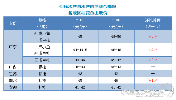 | 中國水產(chǎn)頻道原創(chuàng)報道, 文/圖 何氏水產(chǎn)、水產(chǎn)前沿 李靜 桂花魚 1、本周廣東桂魚價格又出現(xiàn)一次暴漲,塘頭最高開到50元/斤,與上周相比漲了5元/斤左右。近期塘頭開魚價格比較亂,開塘價44-50元/斤不等,跨度比較大。目前最好規(guī)格的魚(6-7成標(biāo)桂,1成中桂)價格上漲到48-50元/斤左右,偏大點的魚價格最高漲到46-48元/斤左右,實際成交價格還要看魚的規(guī)格比例來定。本周暴漲的主要原因是目前老魚的存塘量已經(jīng)很少,新魚還沒到上市時間,預(yù)計7月底新魚會陸續(xù)上市。預(yù)計后期隨著存塘量的減少,桂魚價格或許還有小幅的上漲空間。 2、上周除湖北地區(qū)標(biāo)桂價格上漲1元/斤外,廣西、江蘇、安徽等地的價格與上周都保持穩(wěn)定,銷量也跟上周差不多。 |